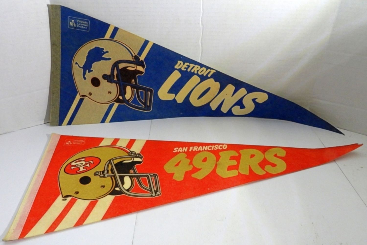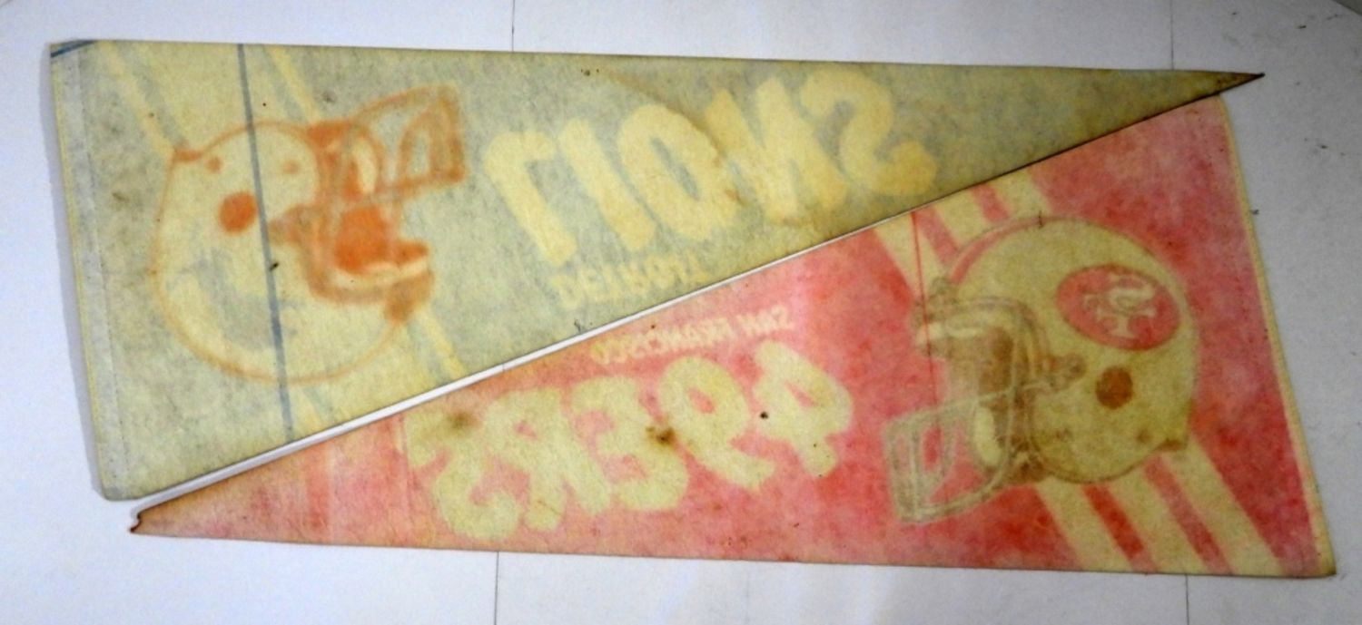 VINTAGE 29″ LONG, NFL OFFICIALLY LICENSED PRODUCT, 1-LIONS SOME DISCOLOR FROM THE YEARS HAS STAPLE HOLES, 1- 49ERS SOME STAINS AND DISCOLOR FROM THE YEARS