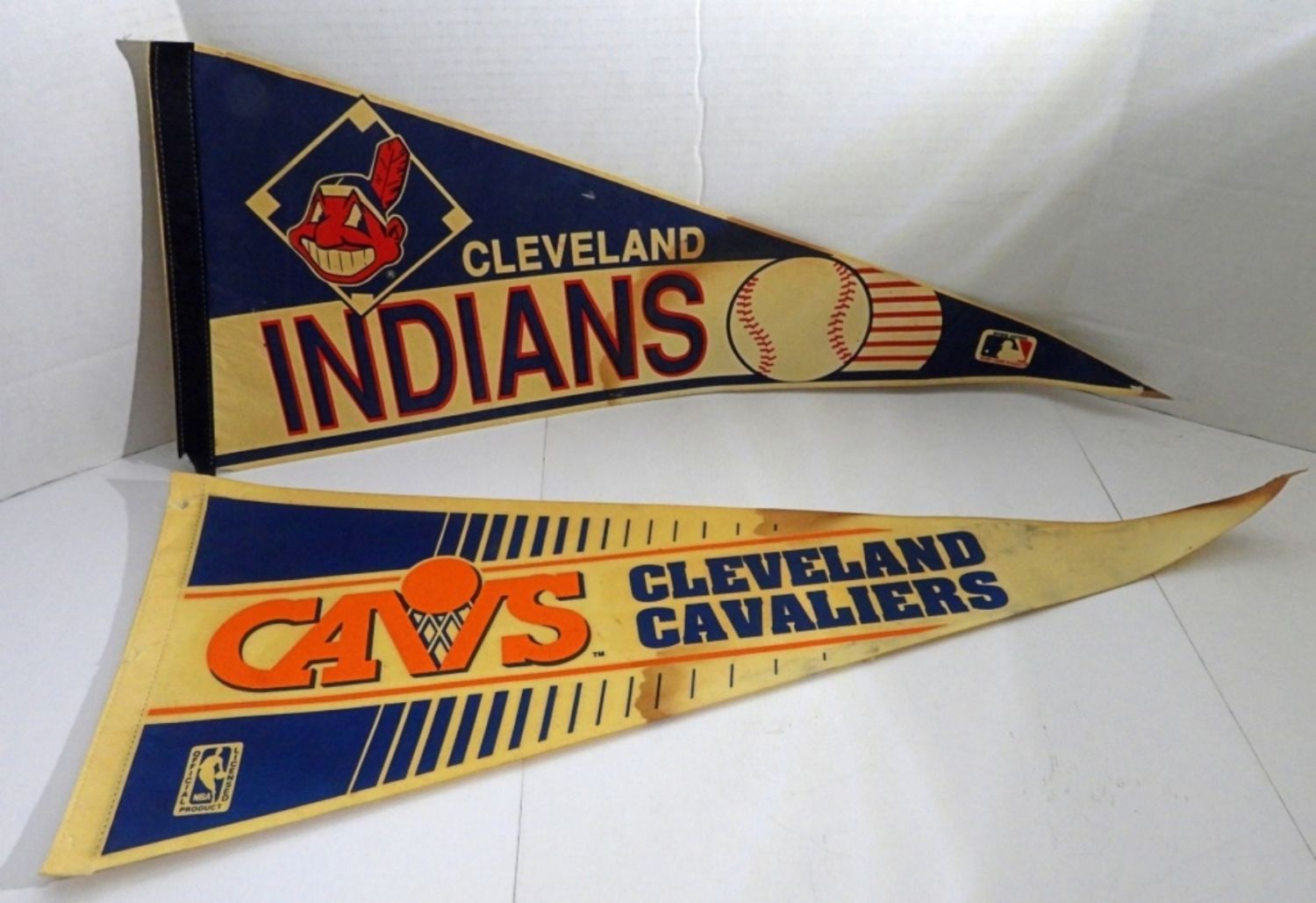 29″ LONG 1- CLEVELAND CAVALIERS OFFICIAL LICENSED PRODUCT, DISCOLORED AND STAINED WITH SOME HOLES AS WELL, 1- CLEVELAND INDIANS OFFICIAL LICENSED MAJOR LEAGUE BASEBALL, DISCOLORED, STAINED BENT AT THE END AND SOME HOLES FROM STAPLES