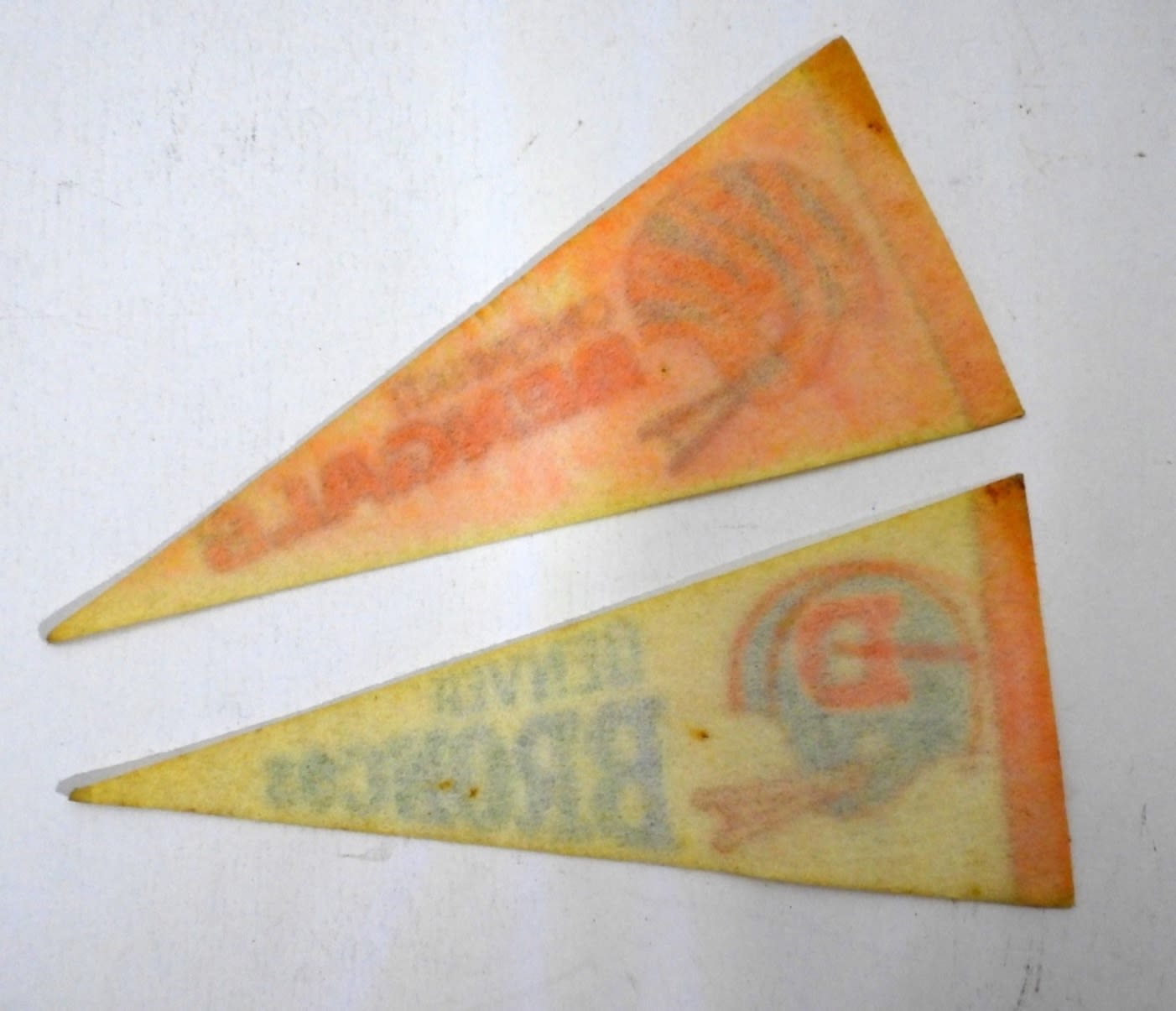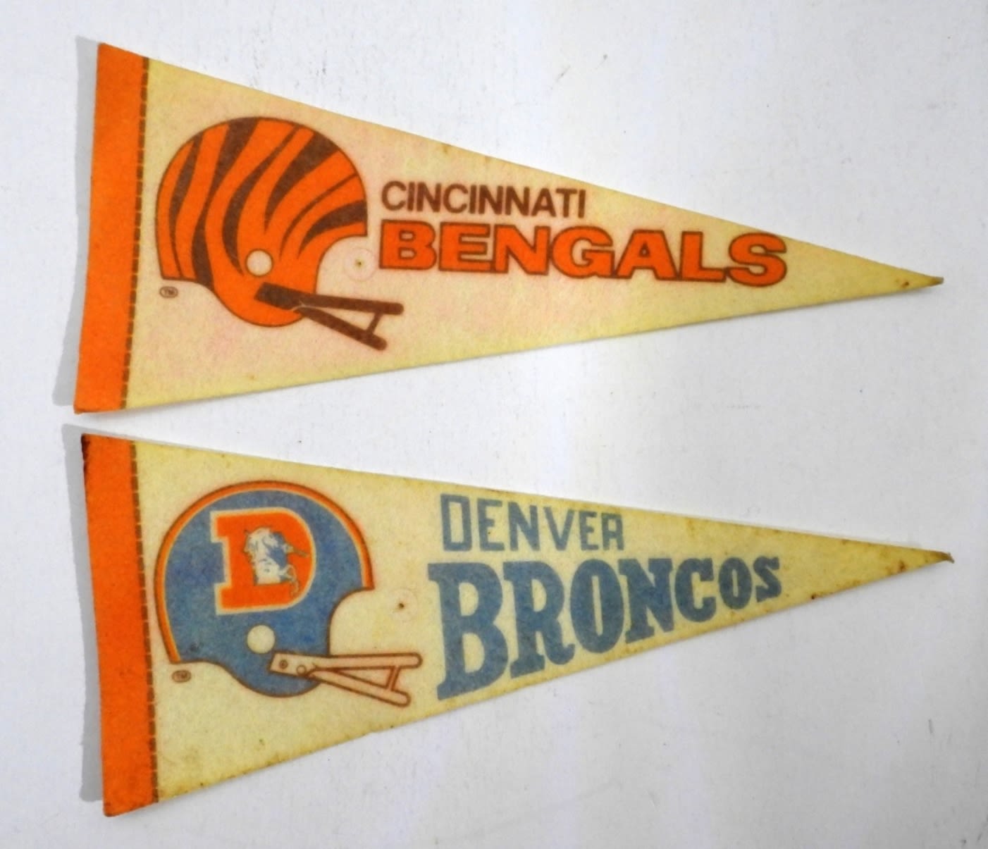 9″ LONG, VINTAGE, 1- CINCINNATI BENGALS 1- DENVER BRONCOS, DISCOLORED , STAINED IN SOME PARTS, BOTH HAVE A HOLE FROM BEING PINNED UP