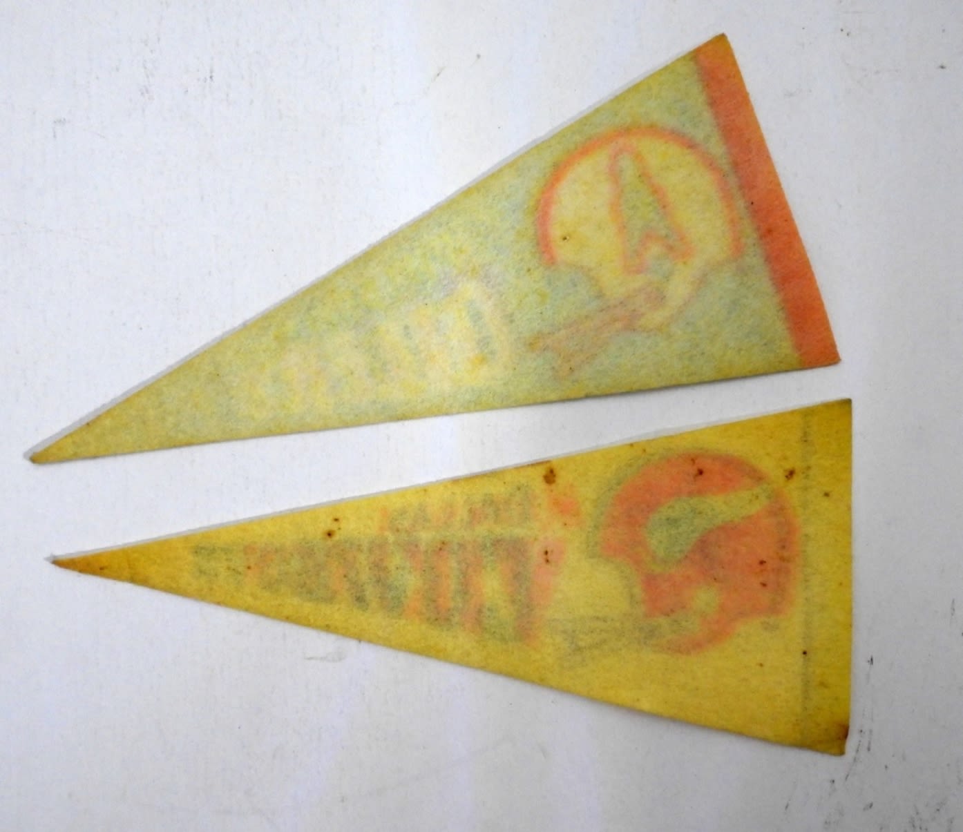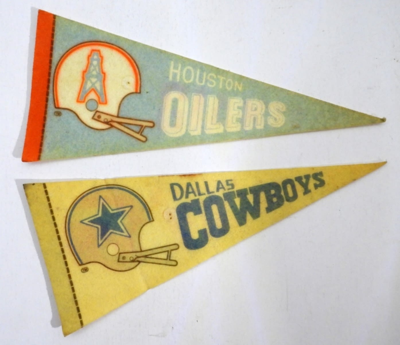 9″LONG, VINTAGE, 1- DALLAS COWBOYS, 1- HOUSTON OILERS, DISCOLORED FROM THE YEARS, BOTH HAVE A HOLE FROM BEING PINNED UP