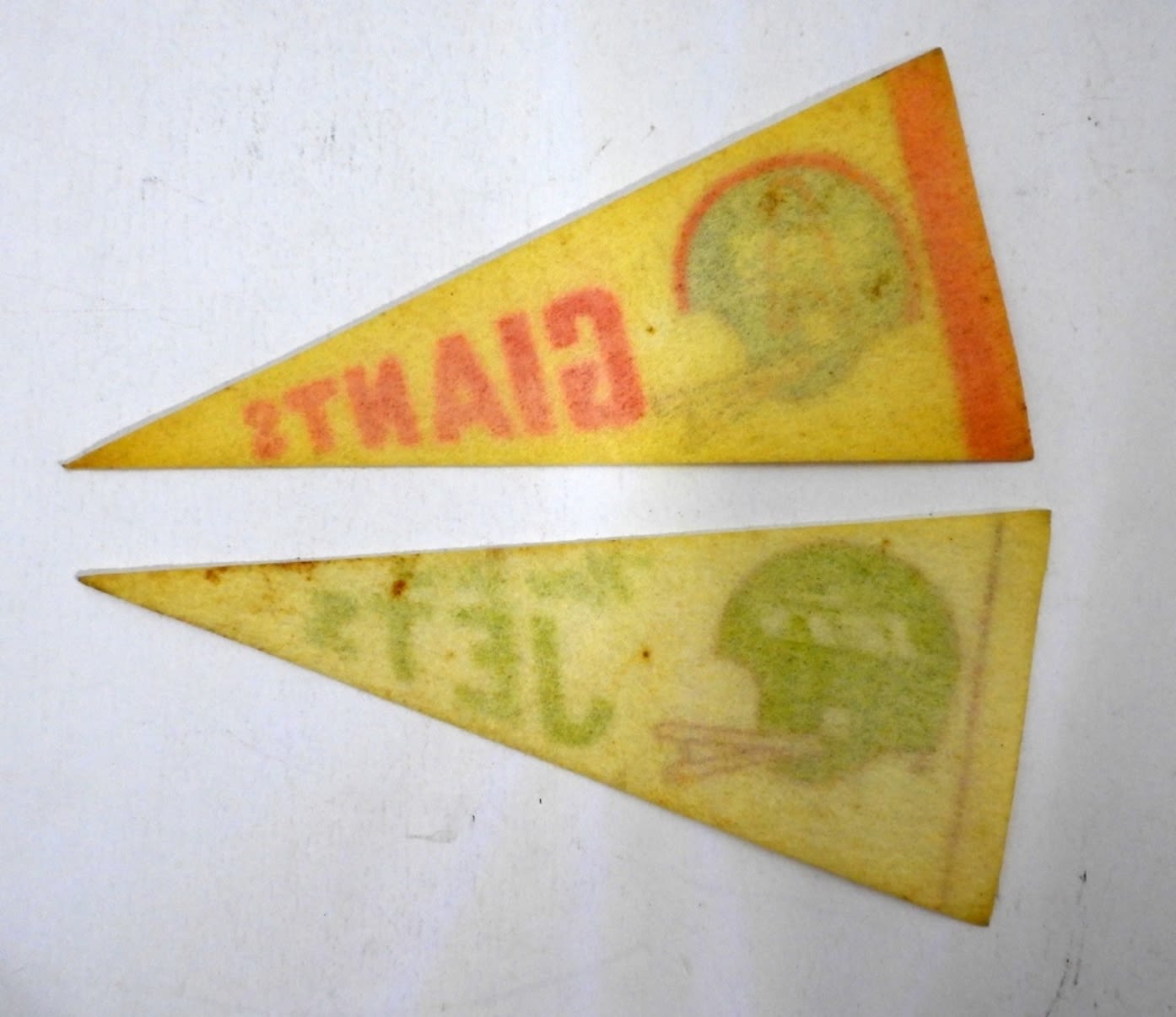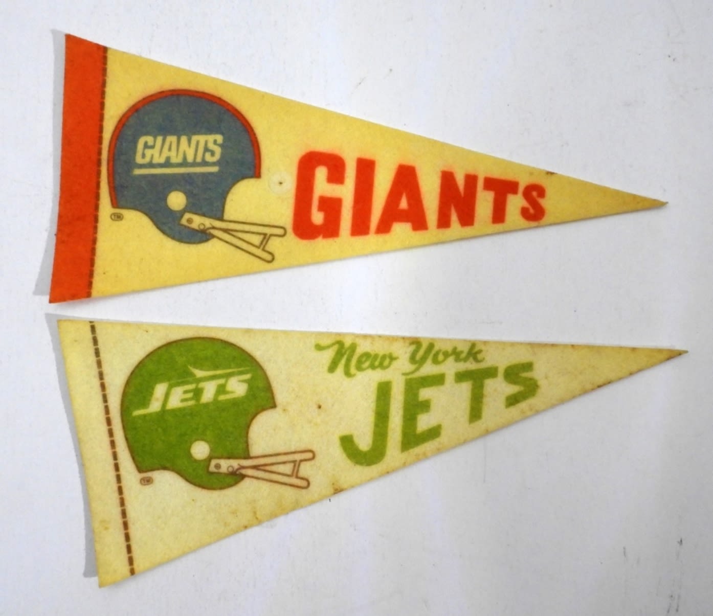 9″ LONG 1- NEW YORK GIANTS, 1- NEW YORK JETS, DISCOLORED FROM THE YEARS, BOTH HAVE A HOLE FROM BEING PINNED UP