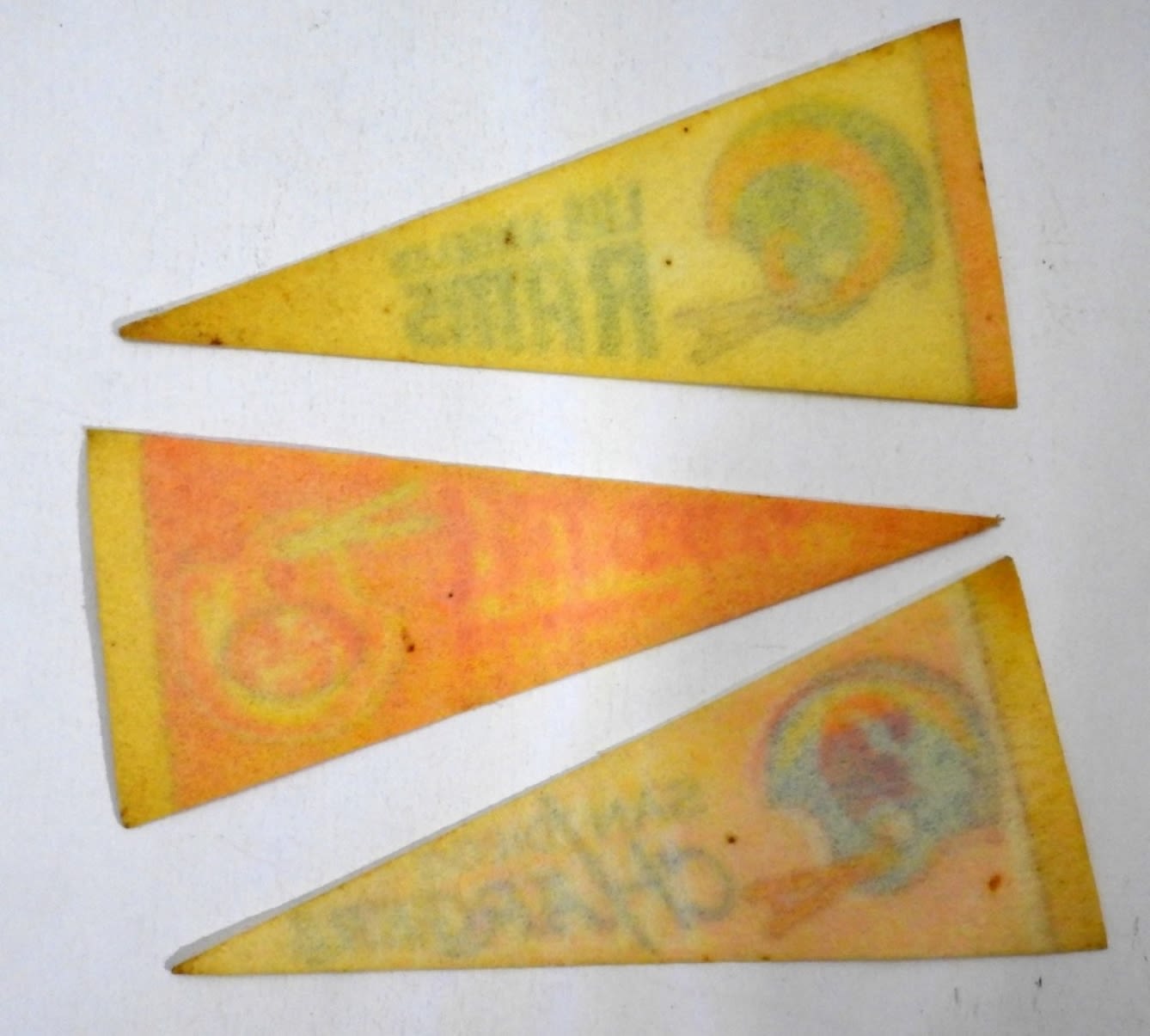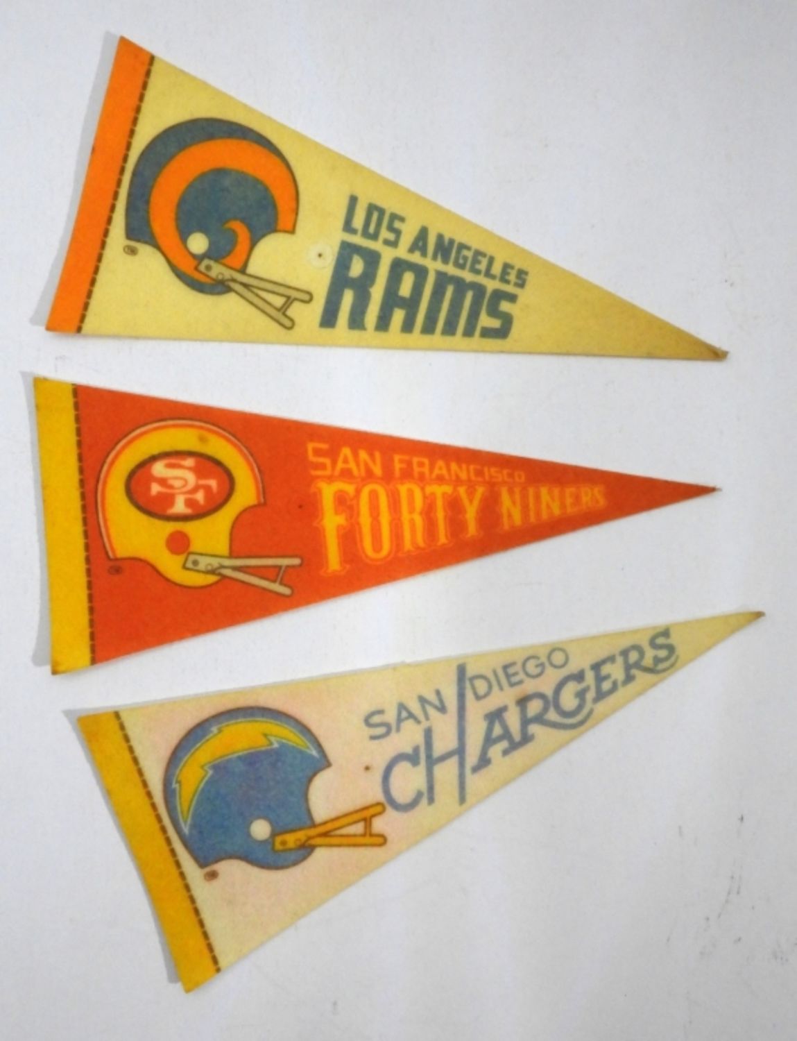9″ LONG, 1- LOS ANGELES, SANDIEGO CHARGERS, SAN FRANCISCO, DISCOLORED FROM THE YEARS, BOTH HAVE A HOLE FROM BEING PINNED UP