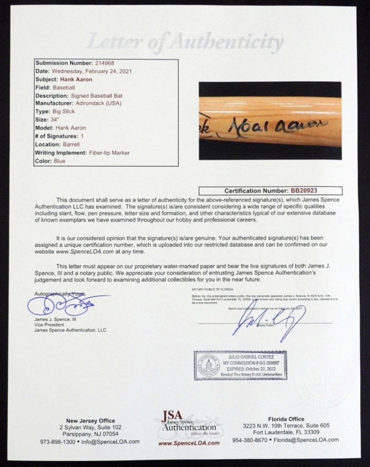 HANK AARON SIGNED BASEBALL BAT JSA