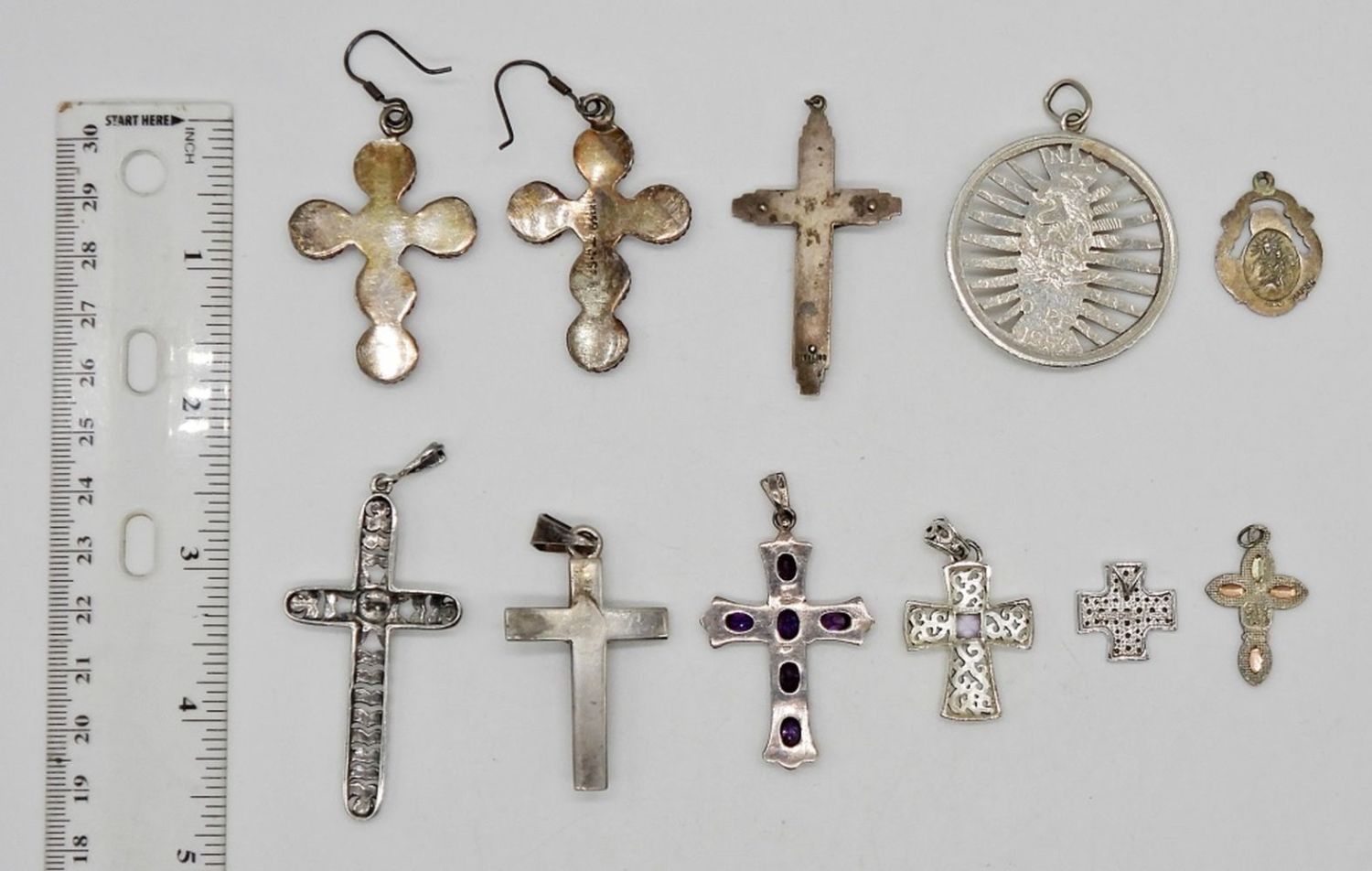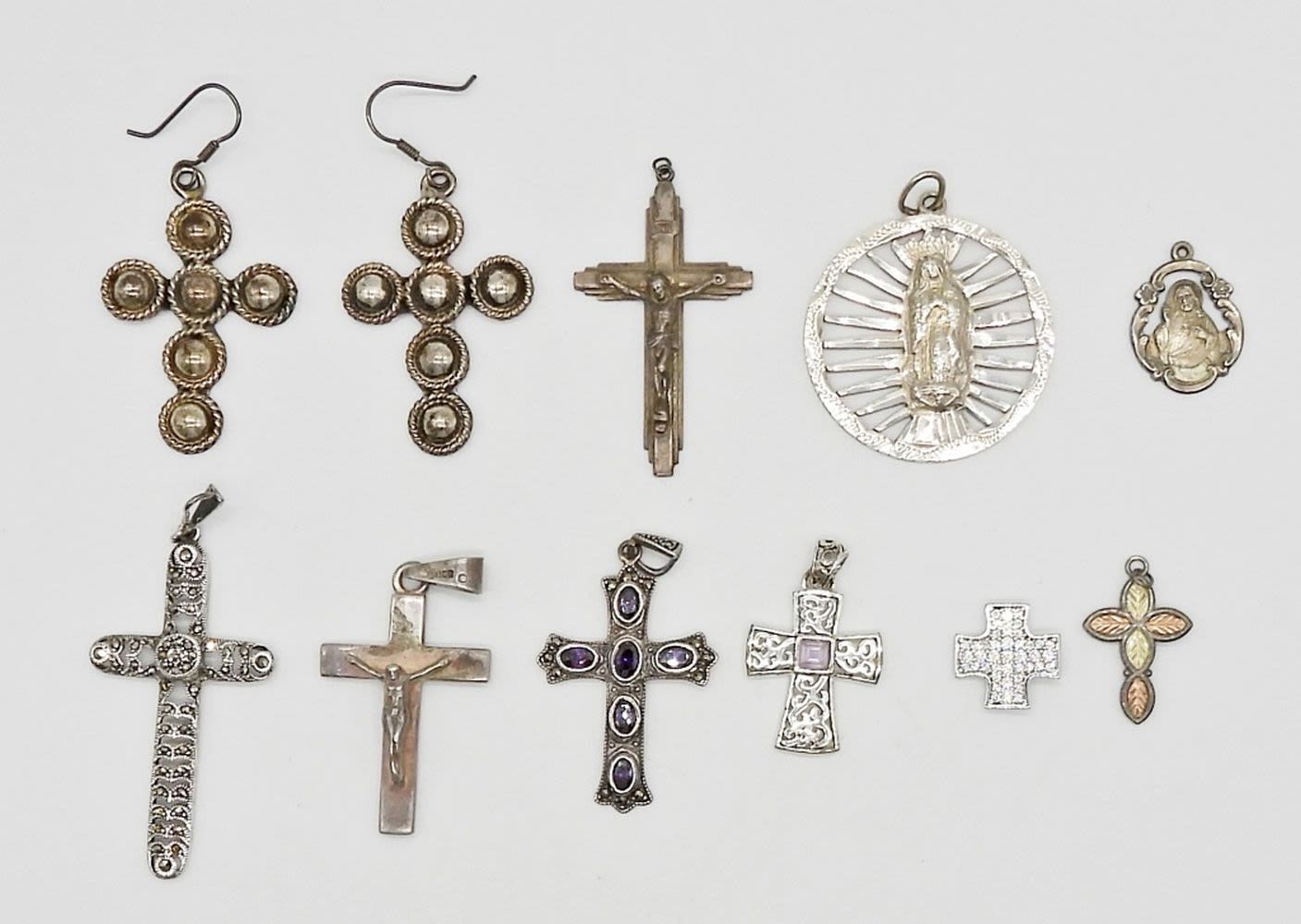 STERLING SILVER (9) CROSS & RELIGIOUS PENDANTS WITH GEMSTONES & MARCASITE; (1) PAIR STERLING CROSS EARRINGS; (46.7 DWT)