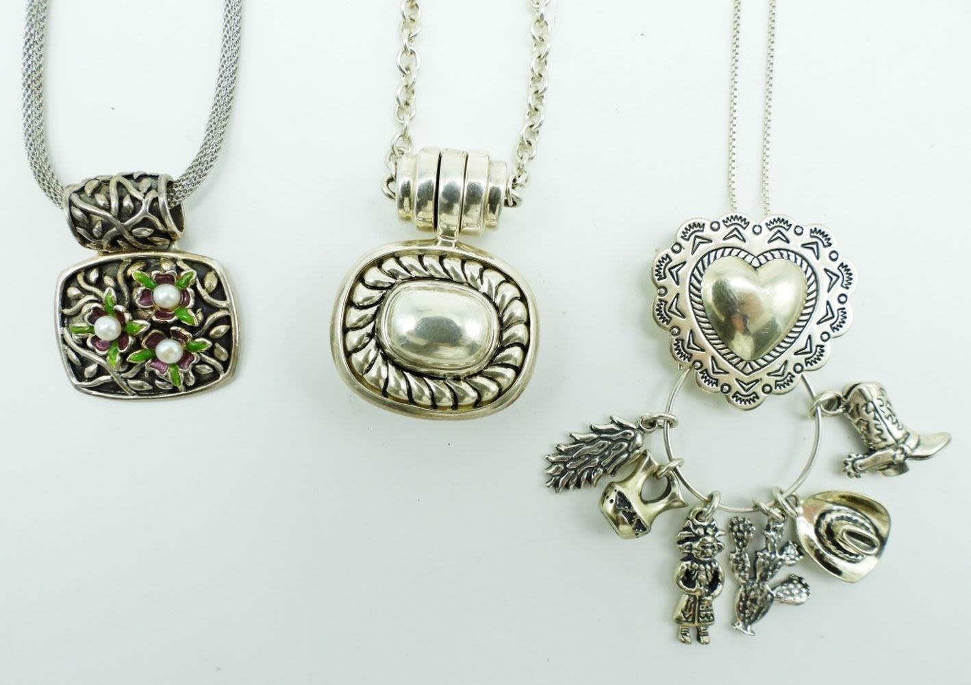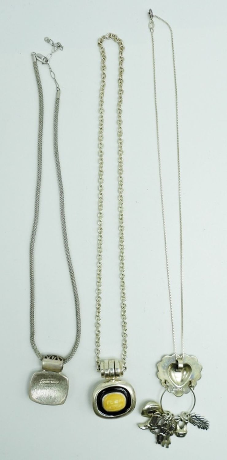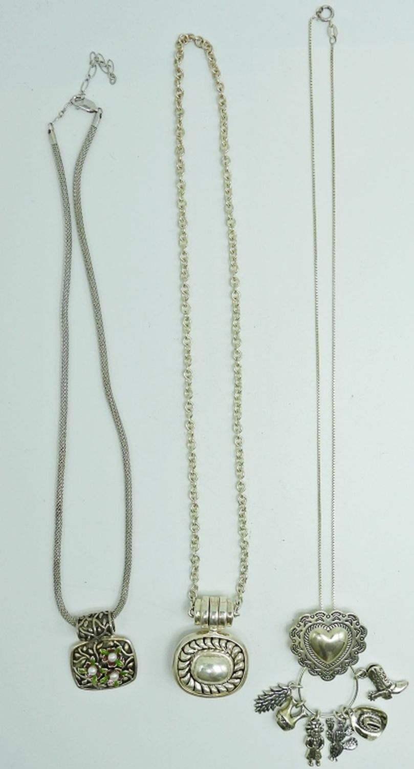 47.3 DWT, ALL NEAR 18″ LONG, 1 FLOWER SQUARE PENDANT W/MESH CHAIN, 1 HEART CHARM HOLDER NECKLACE W/6 CHARMS, 1 BLACK AND YELLOW INLAY PENDANT. CLASP OPENS AT THE PENDANT
