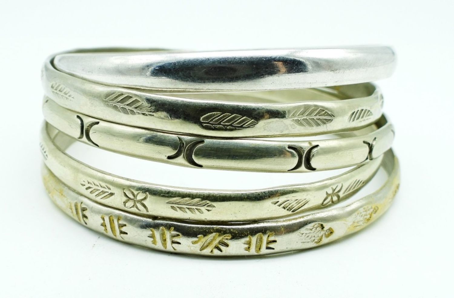 44DWT, 3″ WIDE, EITHER STAMPED MEXICO OR 925 OR STERLING ON THE INSIDE, ETCHED DESIGNS ON 4 OUT OF THE 5