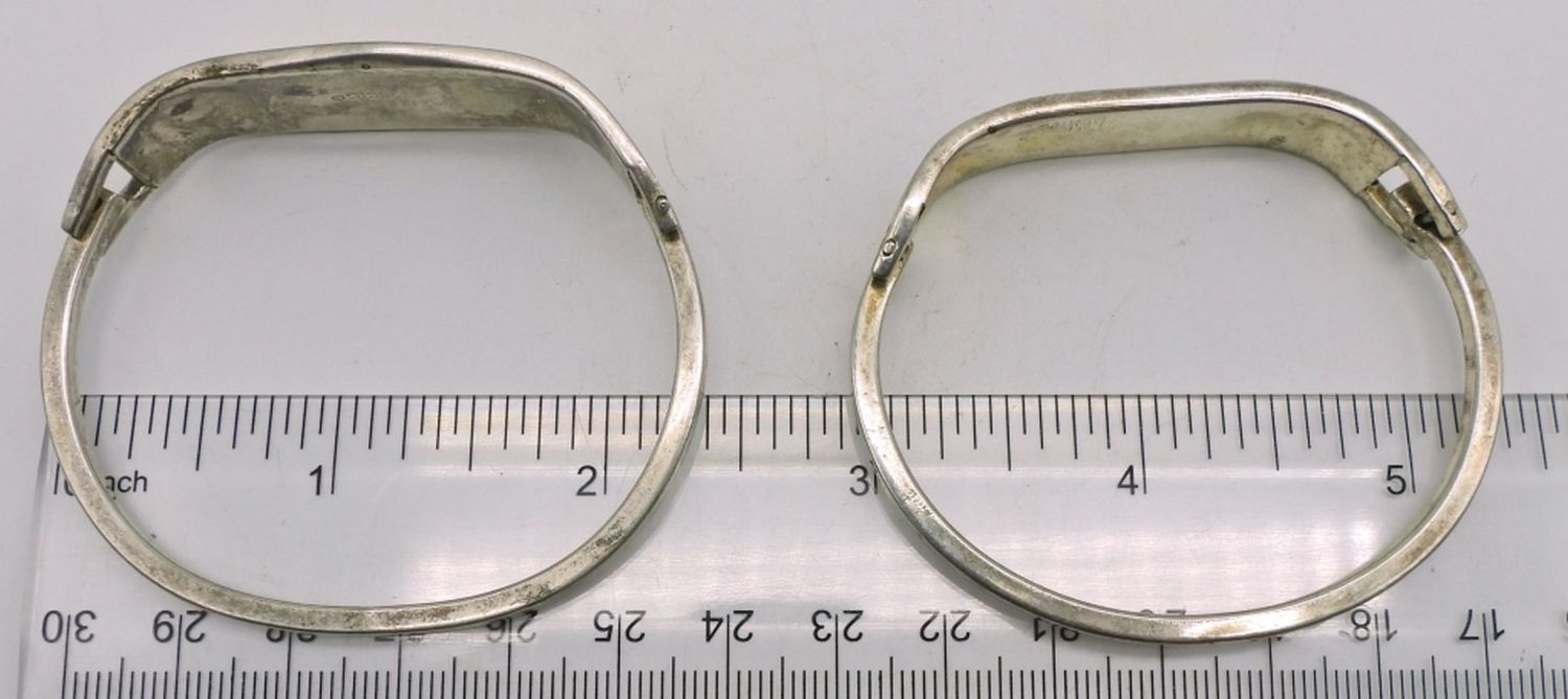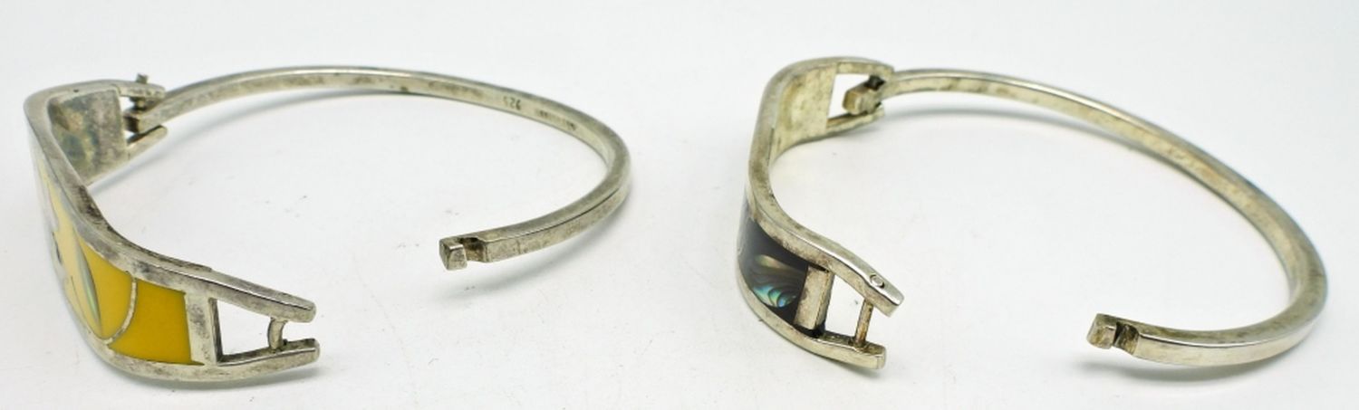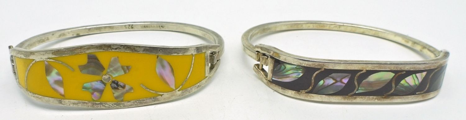 Both Marked Mexico 925, 6.25″ Yellow Abalone Shell Cuff, 6″ Mother of Pearl Inlaid Shell Cuff; 20.2 dwt.