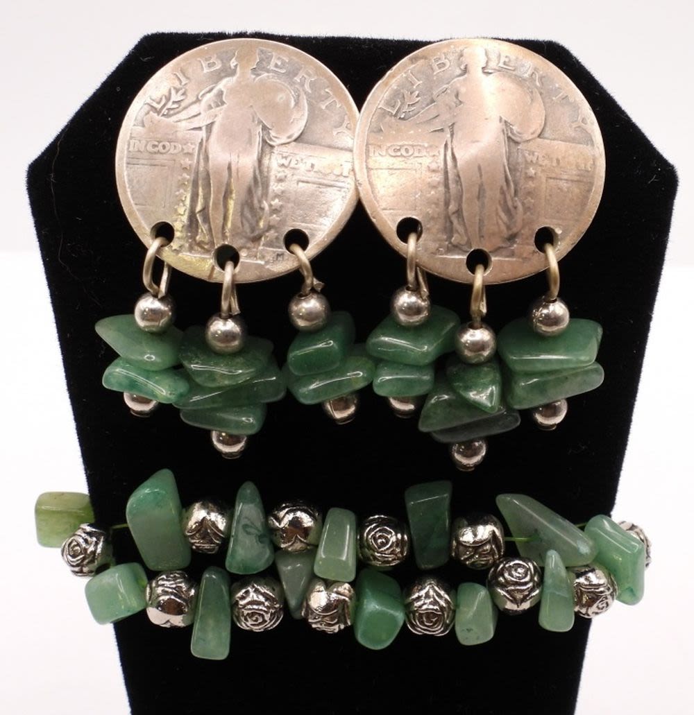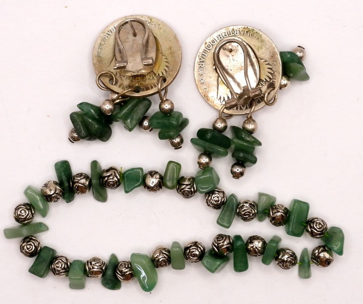 BRACELET with JADEIET STONES – EARRING PIERCED HANDCRAFTED – STRETCH BRACELET w/STERLING BEADS (19 DWT)