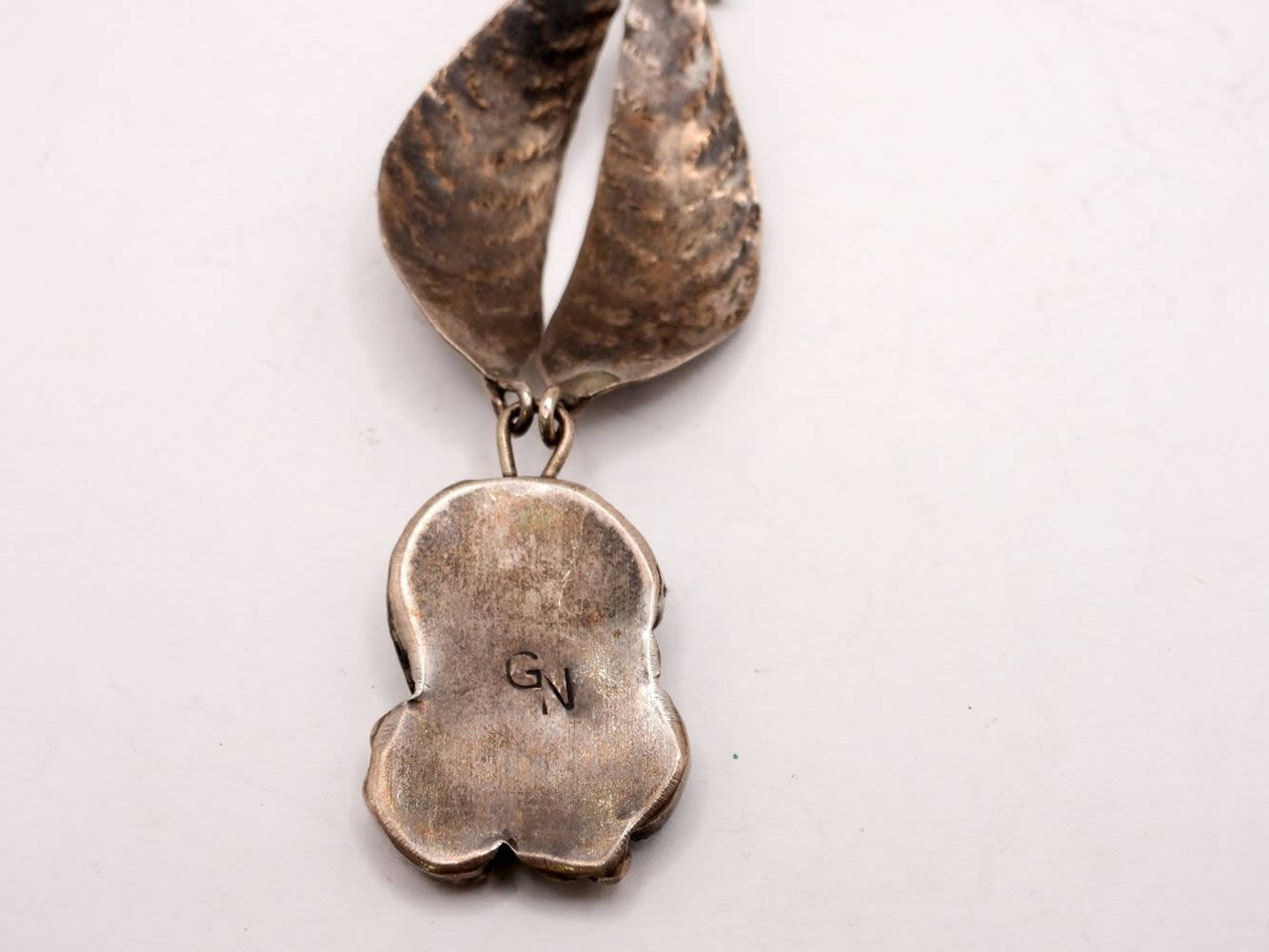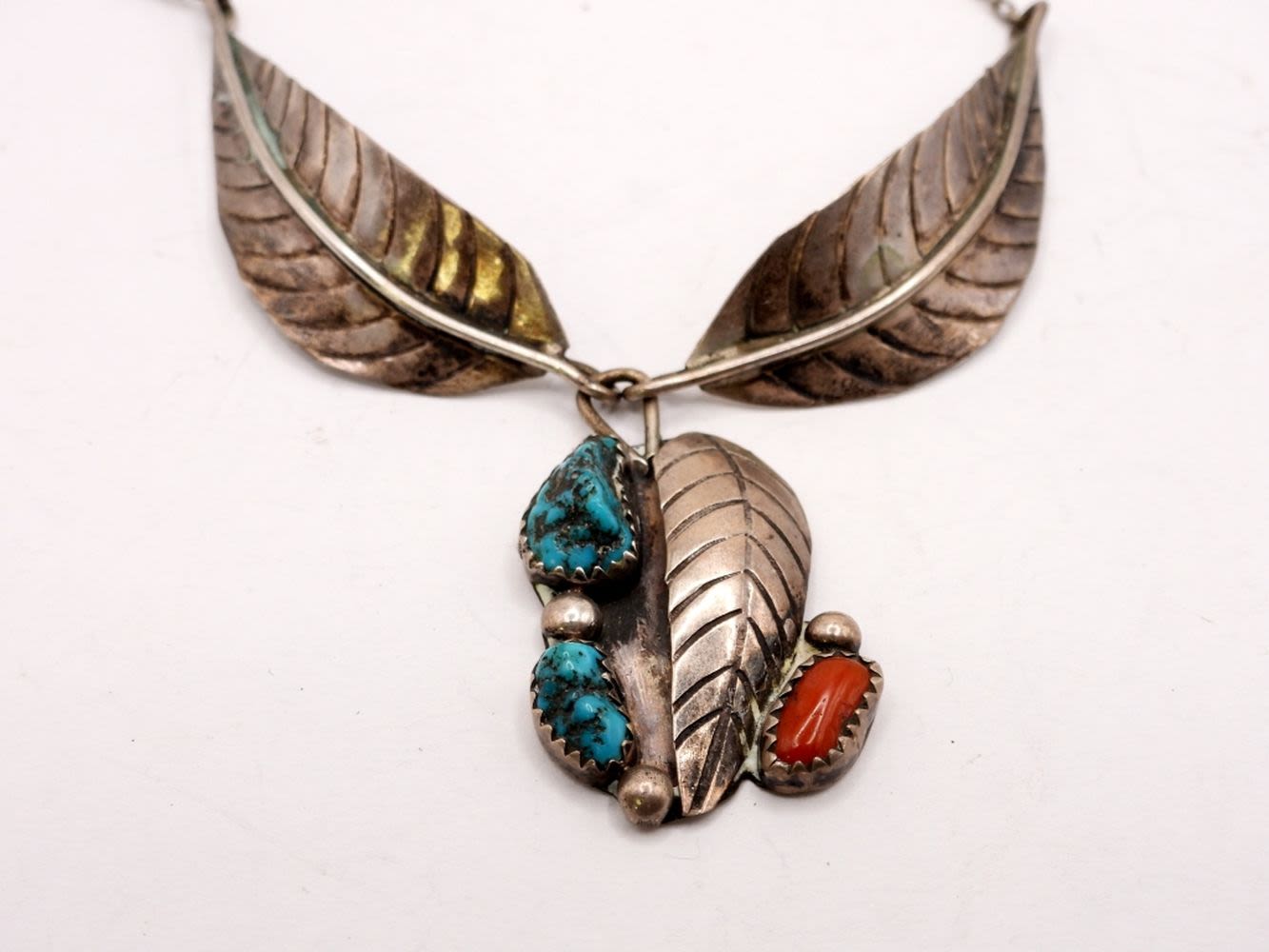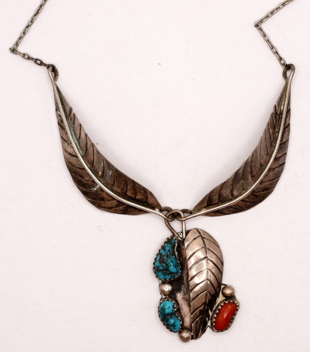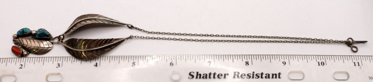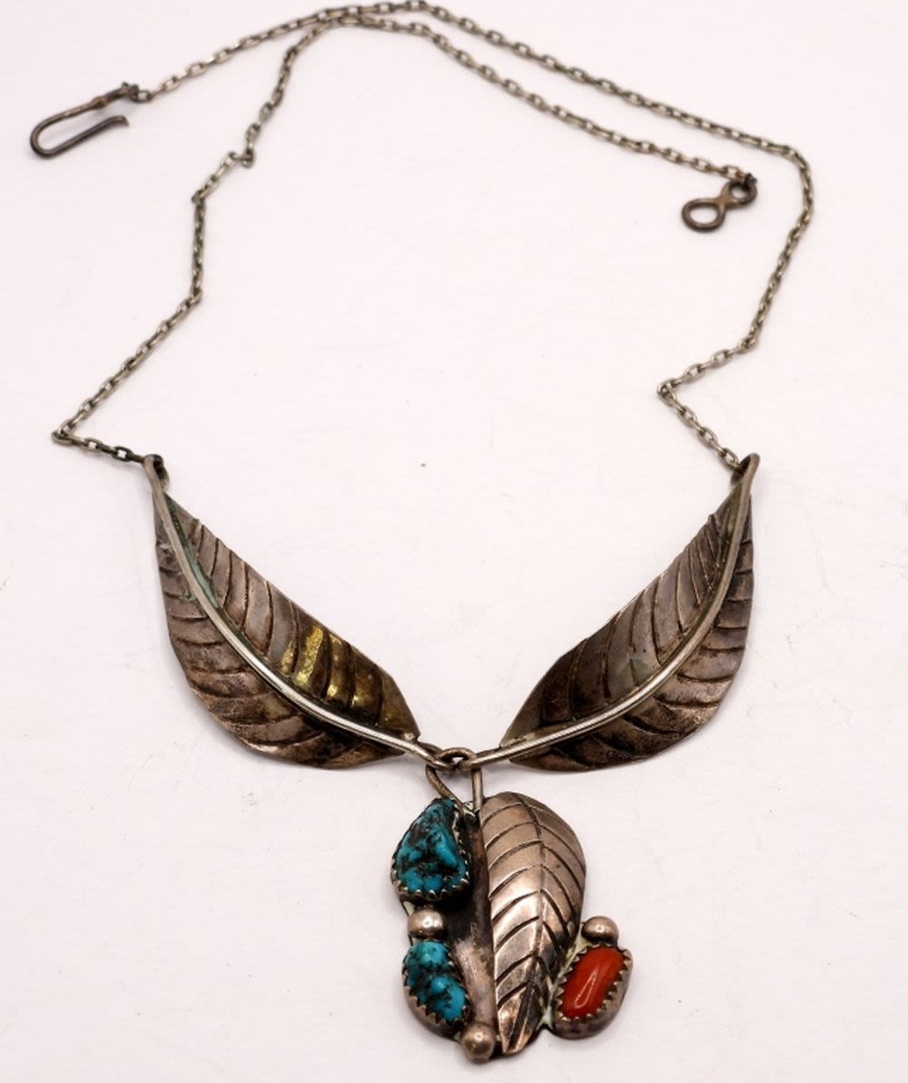 with (2) TURQUOISE STONES (1) CORAL – CLASSIC LEAF DESIGN – 16″ LONG (7 DWT)