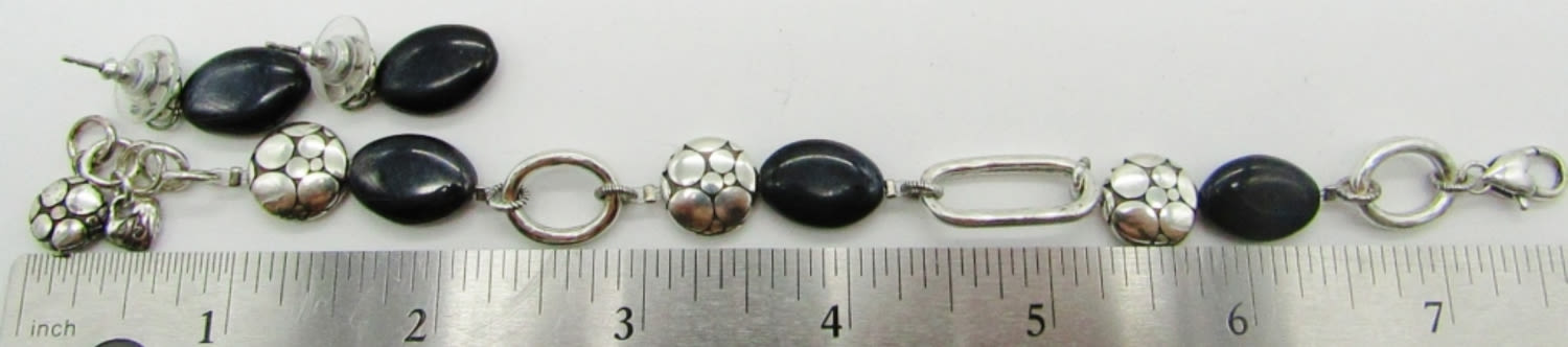 BLACK & TEXTURED SILVER TONE 8″ BRACELET MARKED “B” ON HANG TAG & PIERCED DANGLE EARRINGS.