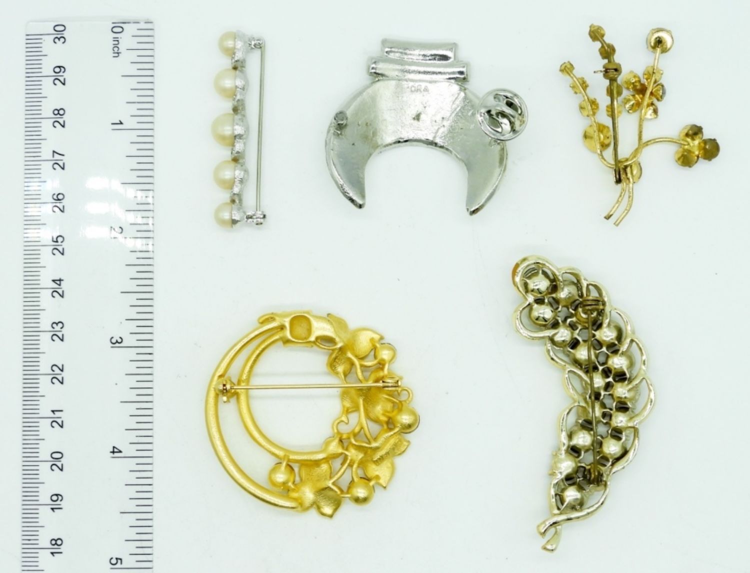 LARGE VINTAGE RHINESTONE FASHION BROOCHES WITH MULTI COLOR GEMSTONES & MOTHER OF PEARL – (1) SIGNED “M.JENT” – (1) SIGNED “ORA”