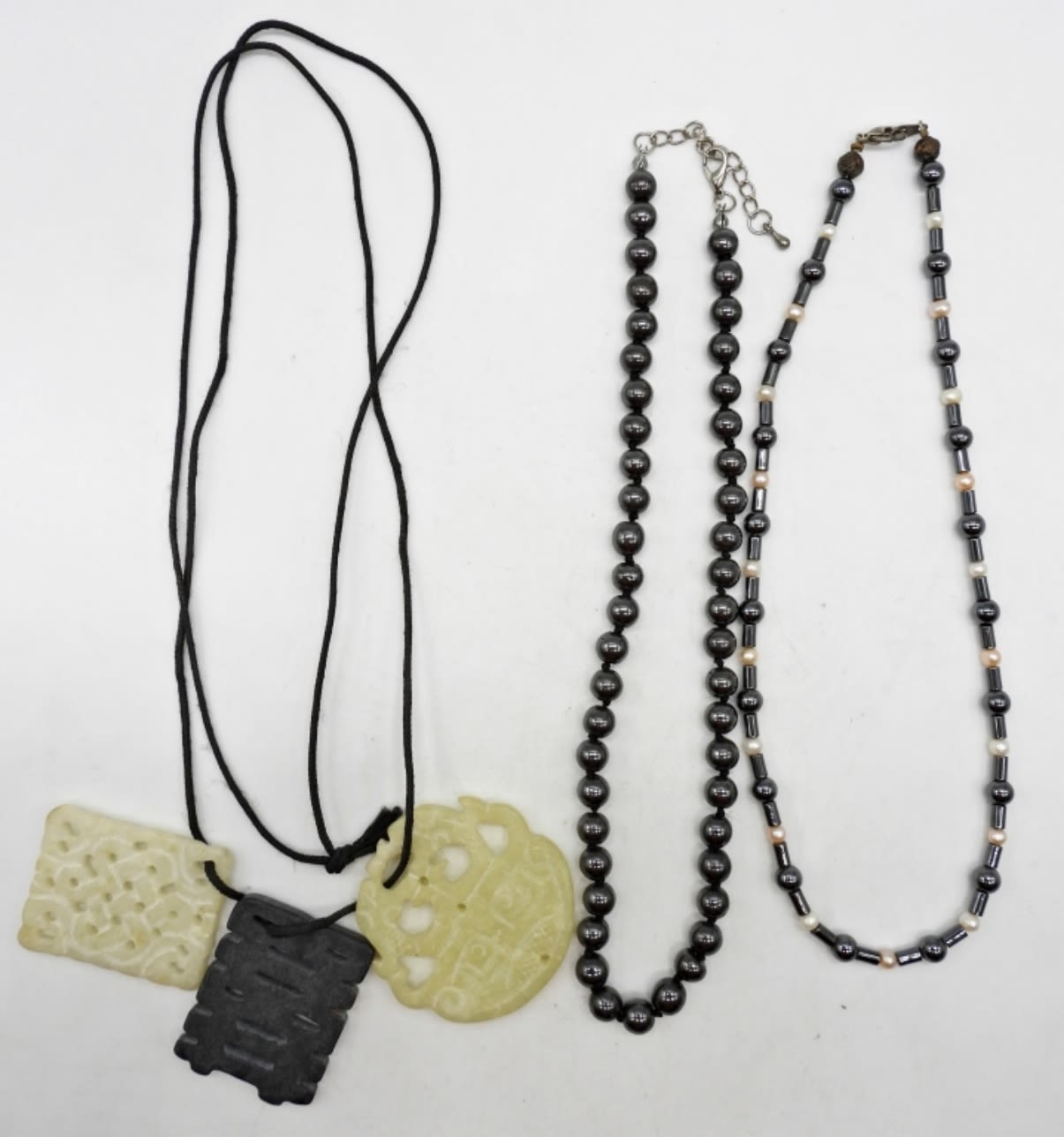 (1) 16″ BLACK & FAUX PEARL BEADED, (1) 18″ BLACK BEADED, & (1) 34″ CORD NECKLACE WITH (3) 2″ CARVED PENDANTS.