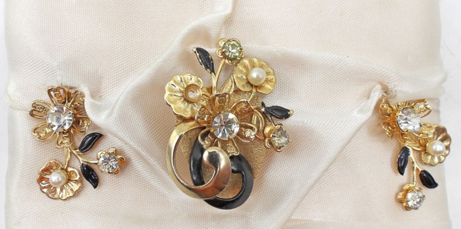 24K GOLD PLATED FLOWER DESIGN SET W/ CLEAR GEMS & FAUX PEARLS. BROOCH MISSING (1) FAUX PEARL.