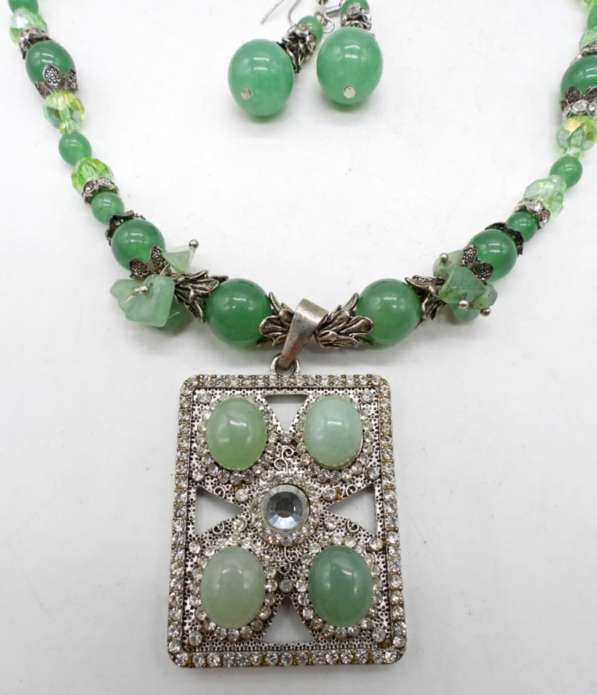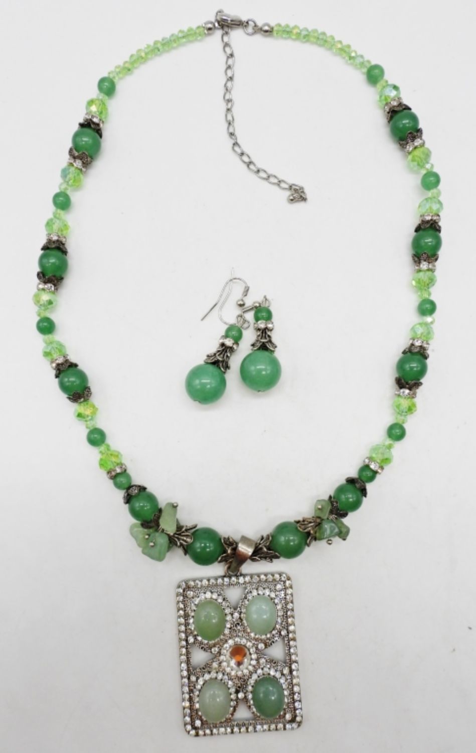 20″ BEADED NECKLACE W/ 2″ SILVER-TONE PENDANT & PIERCED DANGLE EARRINGS. NECKLACE MISSING (1) ACCENT RHINESTONE NEAR CLASP.