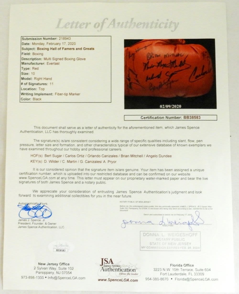 HALL of FAMERS and GREATS – JSA CERT #BB38583 – (11) SIGNATURES – HOF(s) BERT SUGAR / CARLOS ORTIZ / ORLANDO CANIZALES / BRIAN MITCHELL / ANGELO DUNDEE & KEY(s) D. WILDER / C. MARTIN / G. CANIZALES / A. PRYOR