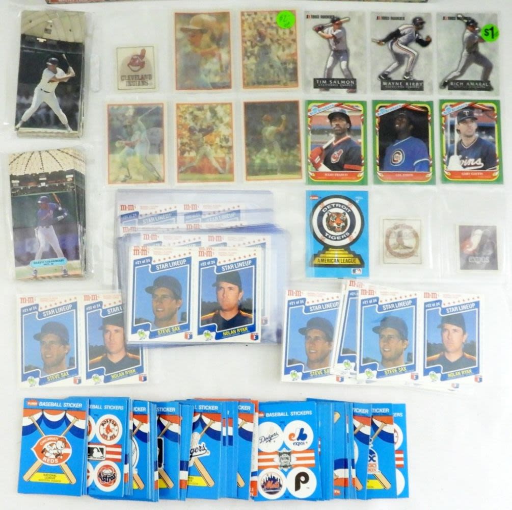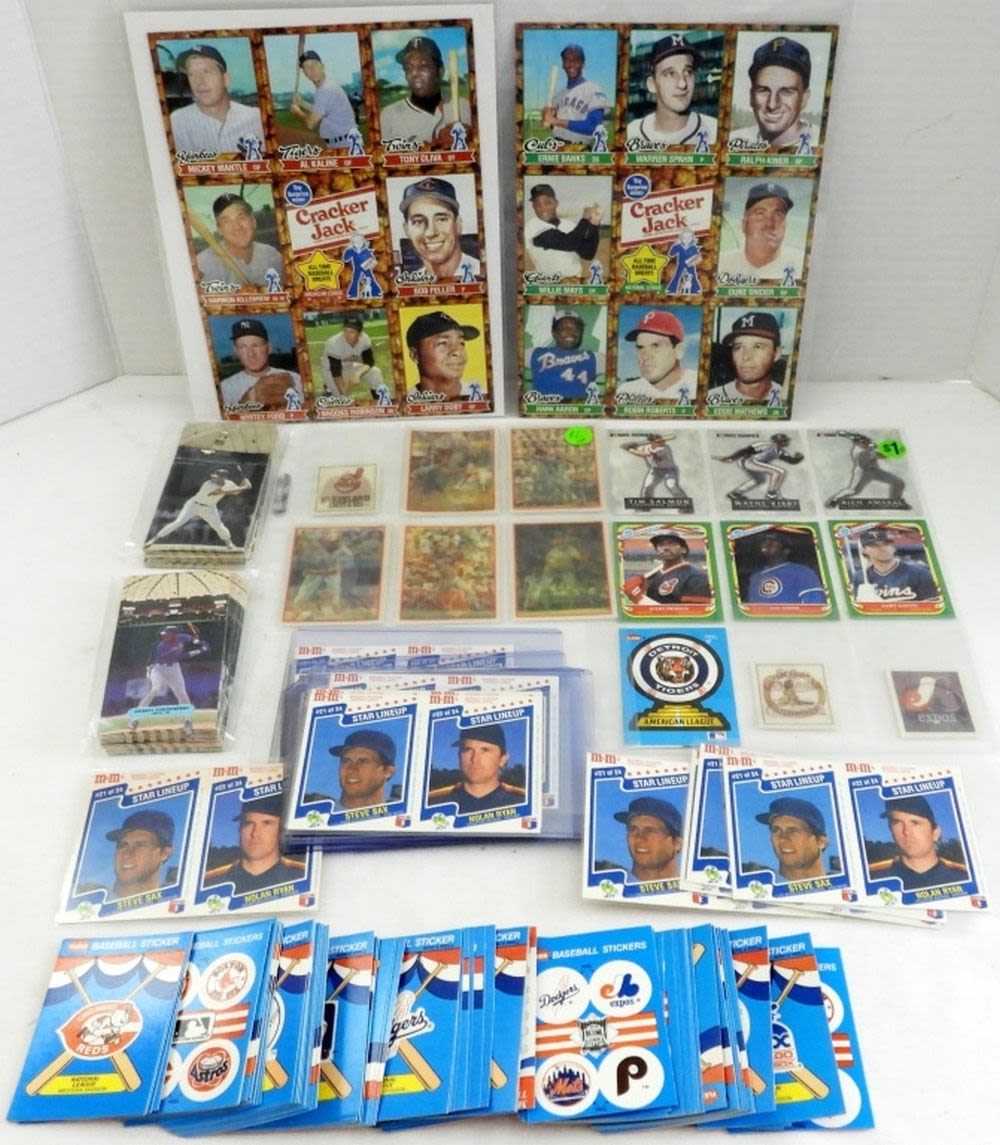 (16) 1987 M&M RYAN/SAX CARDS, (2) CRACKER JACK UNCUT SHEETS, POP-UP CARDS, STICKERS & MORE