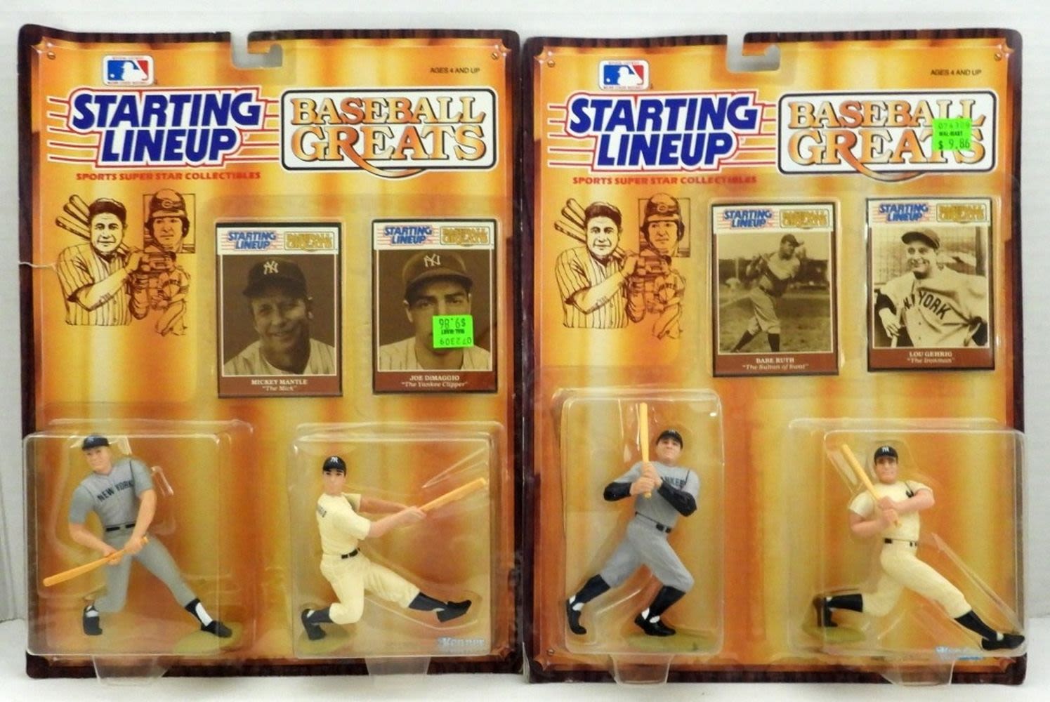 1989 MADE BY KENNER OFFICIAL LICENSEE MAJOR LEAGUE BASEBALL, 1- COMES WITH MICKEY MANTLE AND JOE DIMAGGIO, 1- BABE RUTH AND LOU GEHRIG, PACKAGING HAS SOME RIP AND NORMAL WEAR FROM THE YEARS