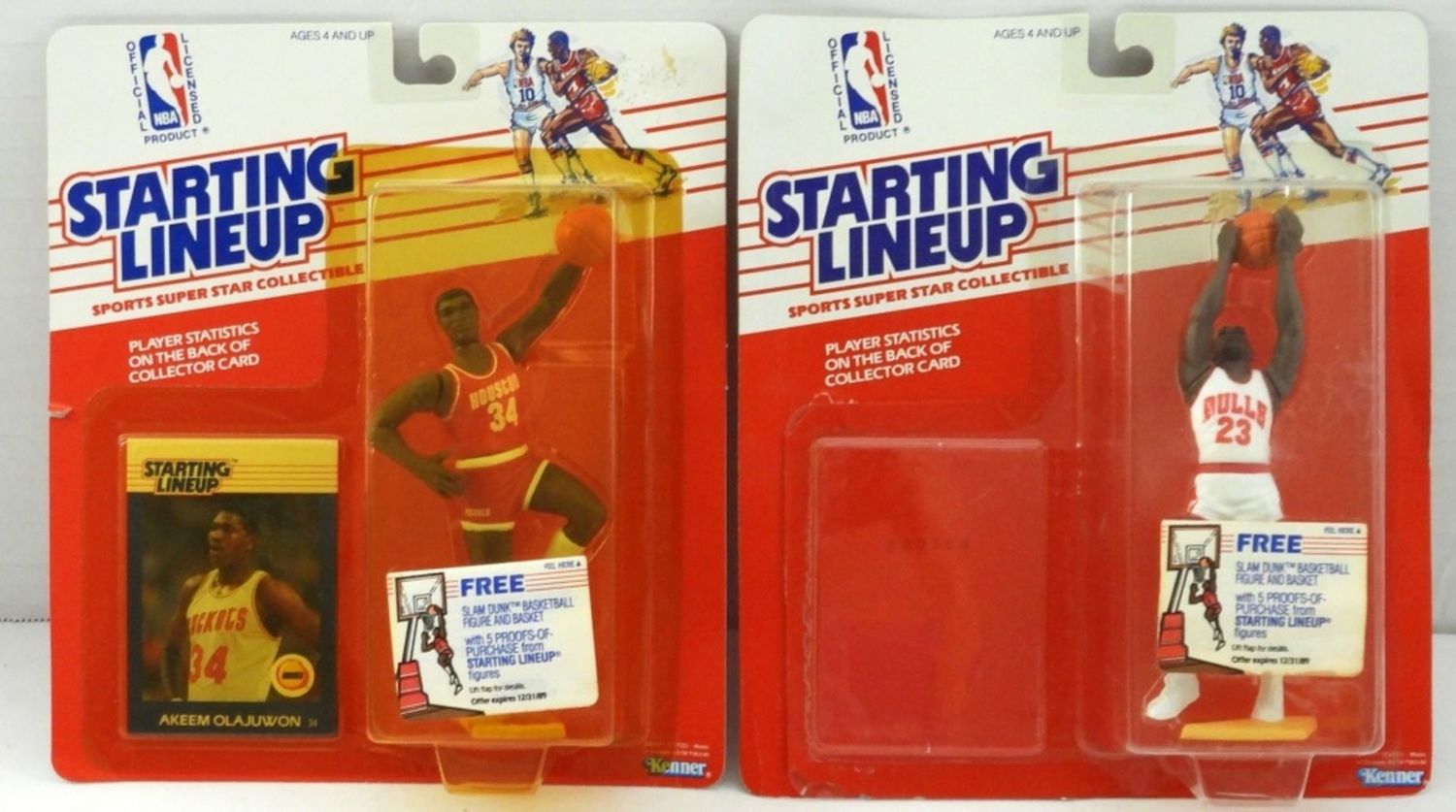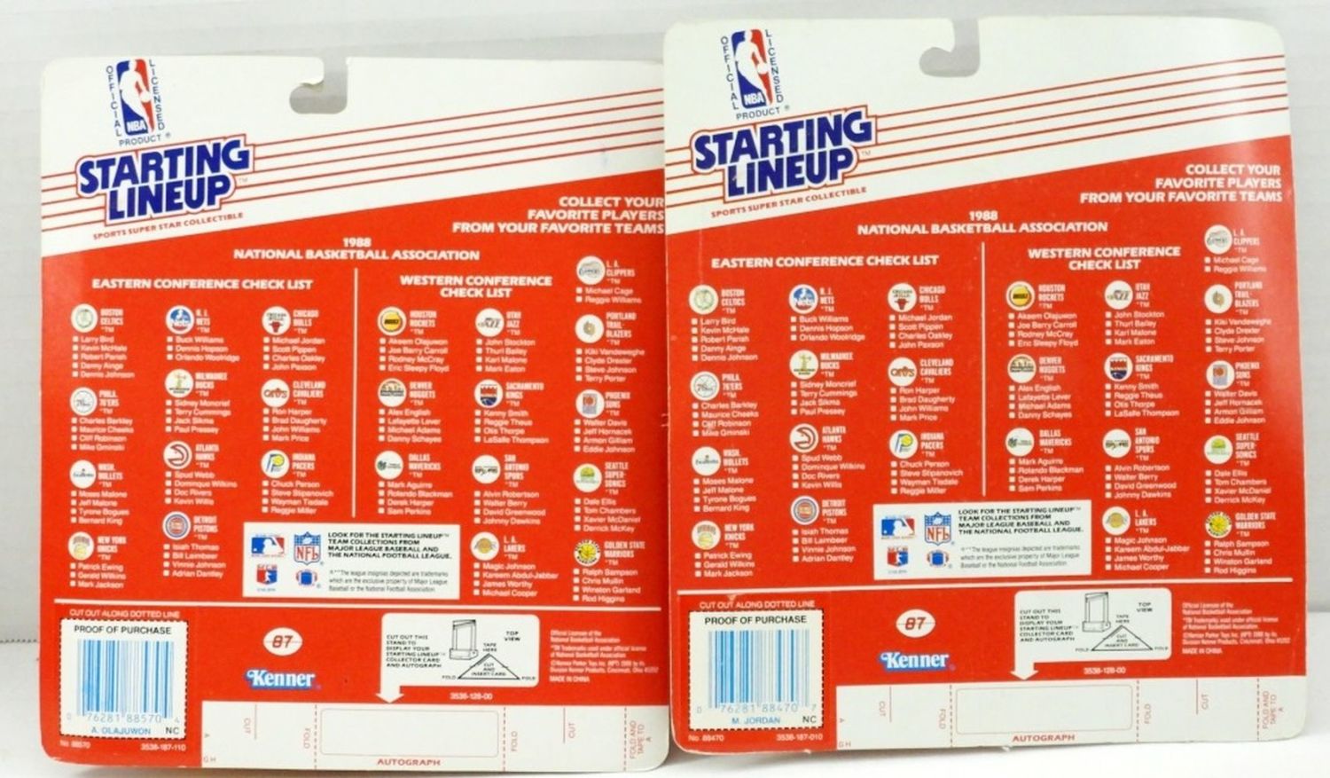 BOTH FROM 1988 BY KENNER 1-AKEEN OLAJUWON, 1- MICHEAL JORDAN ( IS MISSING THE CARD FROM THE BOX BEING OPEN ON THE SIDE)