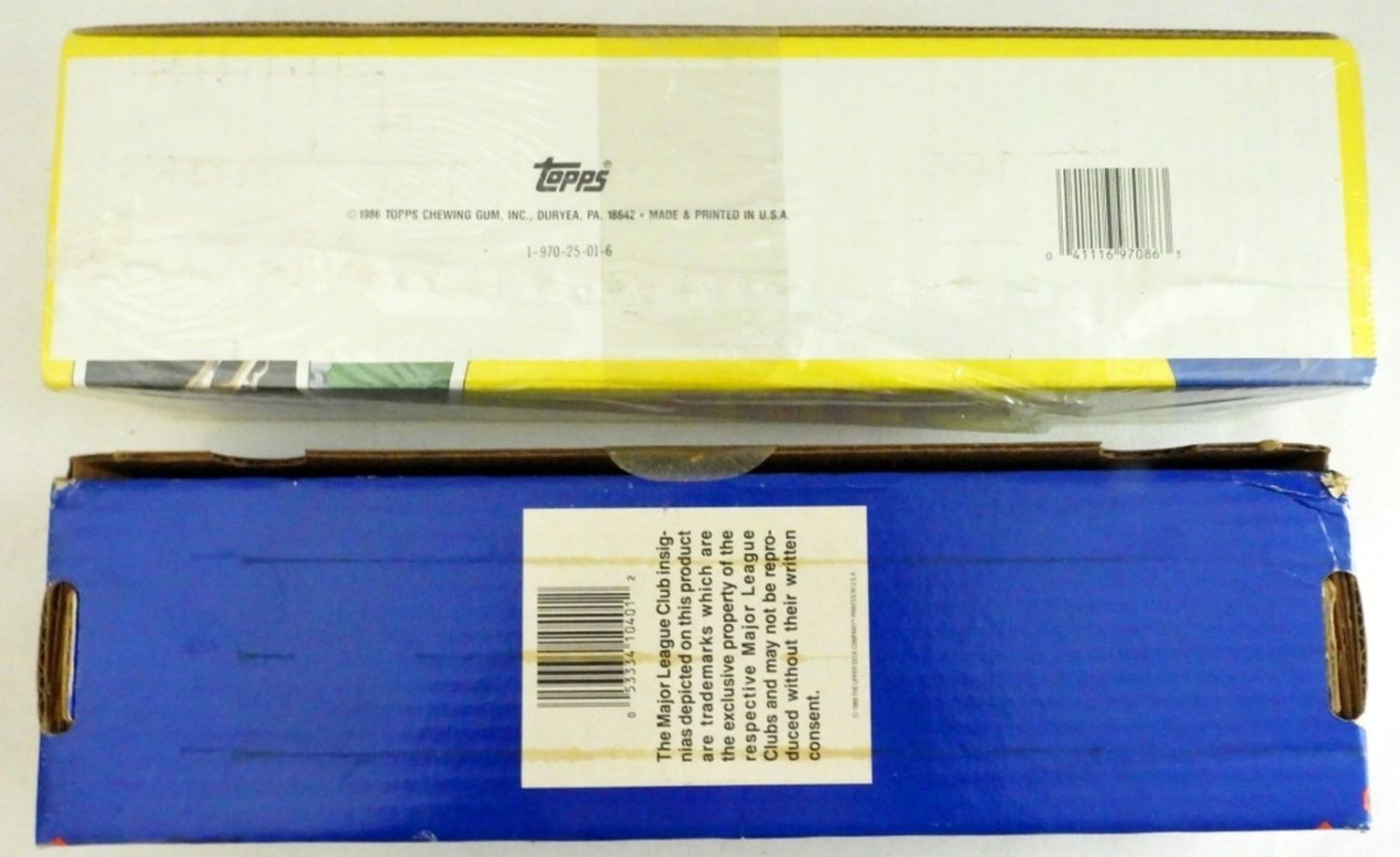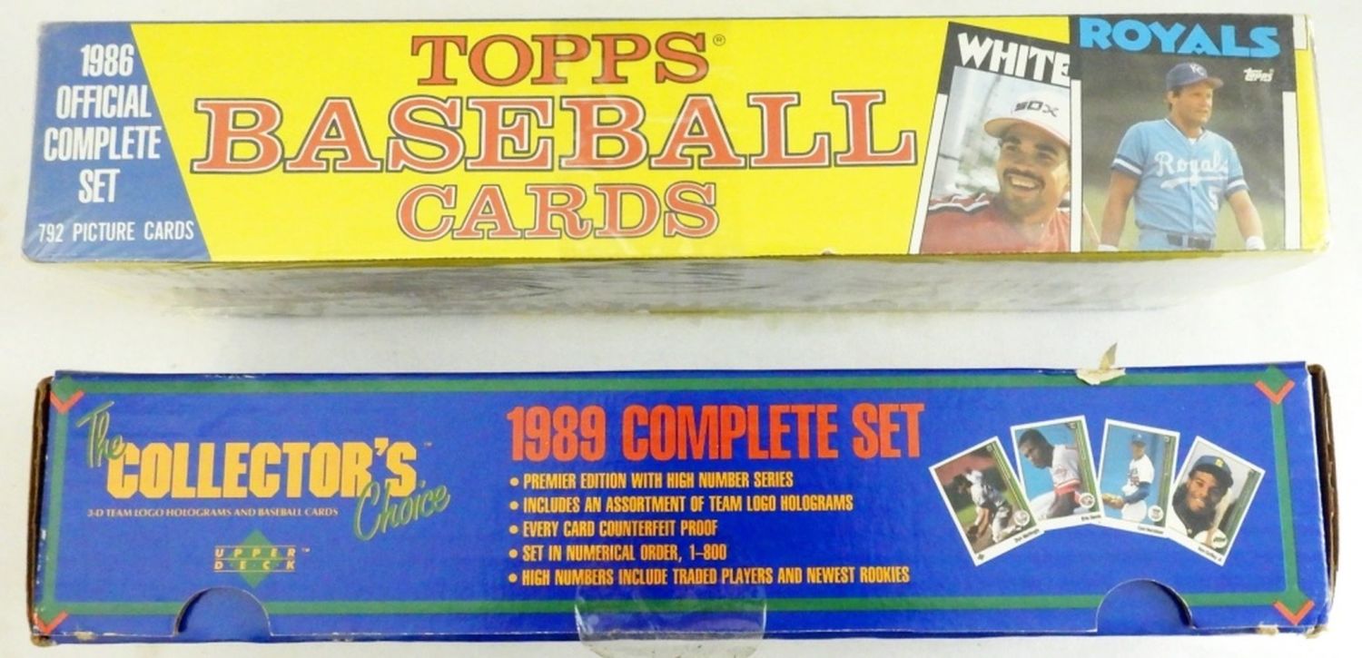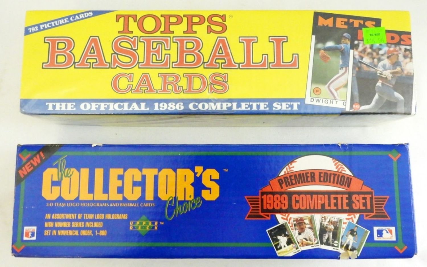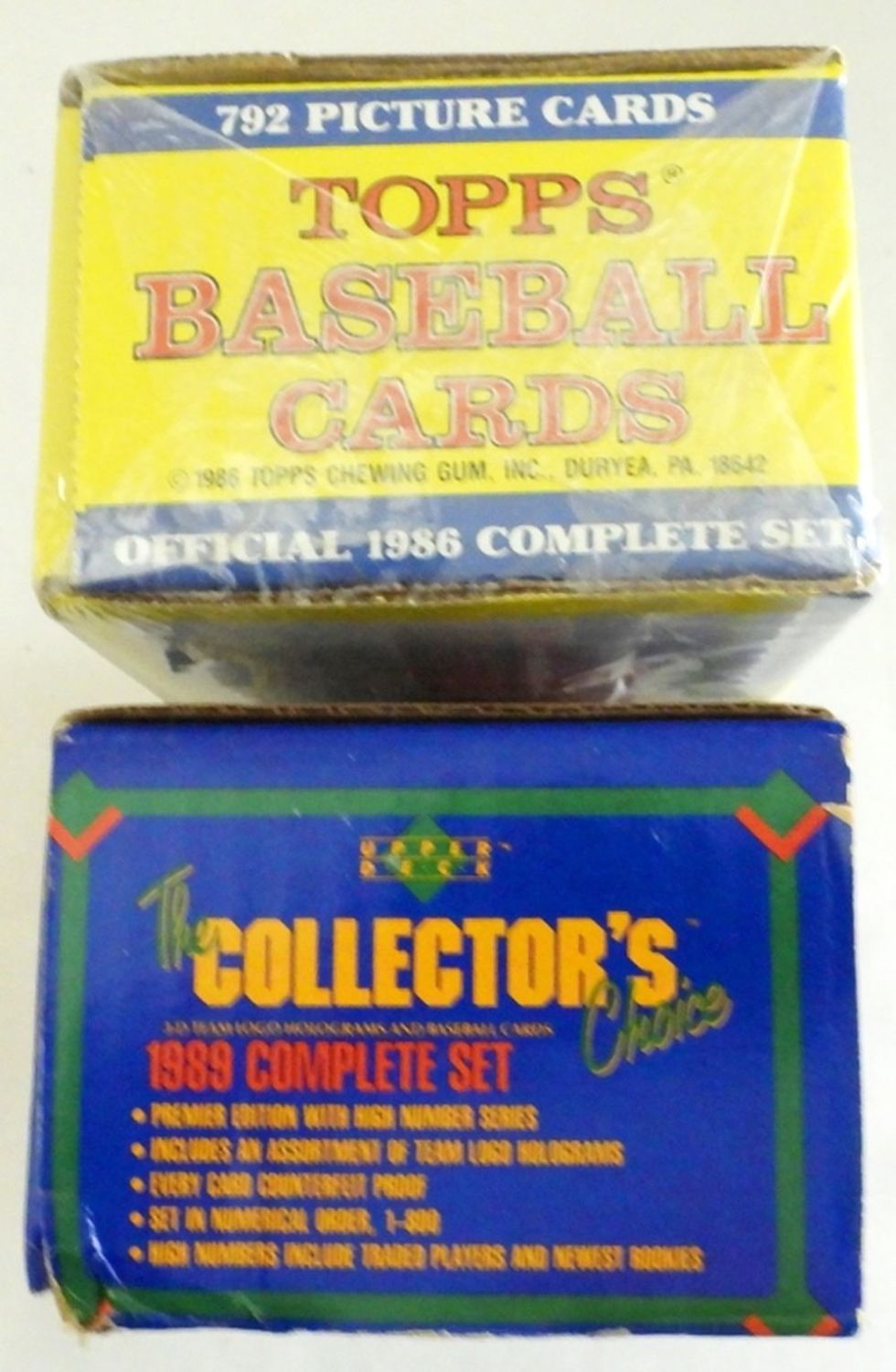 1986 TOPPS BASEBALL CARDS OFFICIAL COMPLETE SET FACTORY SEALED (SEAL IS LOOSE/TORN); 1989 THE COLLECTOR’S CHOICE COMPLETE SET PREMIER EDITION (SEALED WITH LOOSE LABEL)