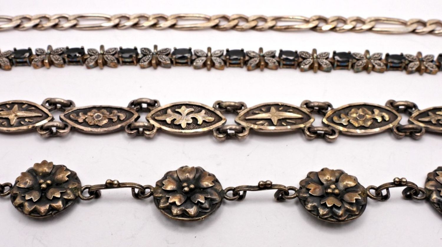 7 1/2″ LONG, FLORAL 7″, CELTIC STYLE needs clasp repair, FIGARO 8″ (46 DWT)