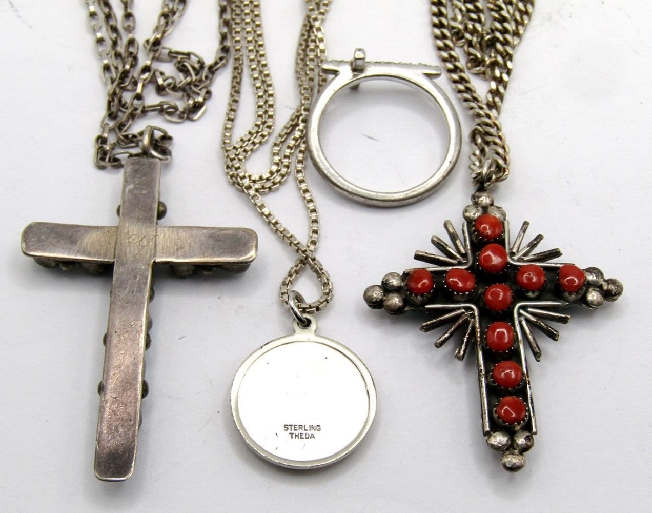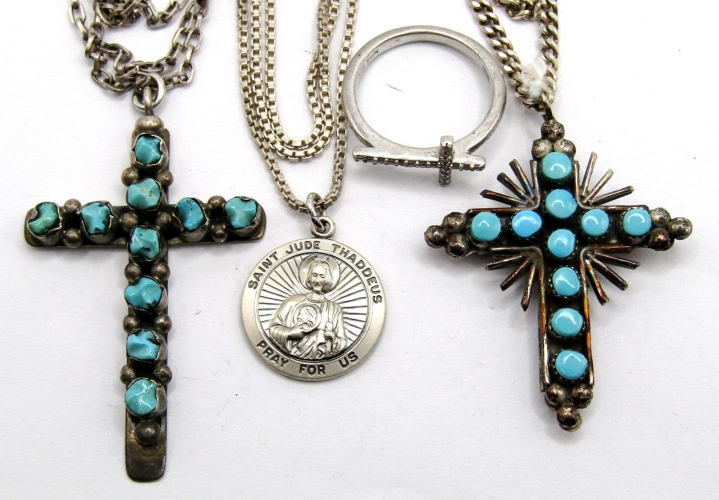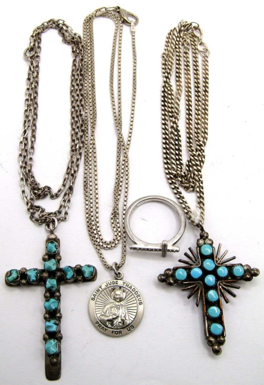 (1) REVERSIBLE CROSS with CORAL on one side, (1) ST JUDE PENDANT – ALL on 925 CHAINS 18″ & 24″ plus CROSS STERLING RING SIZE 7 (26 DWT)