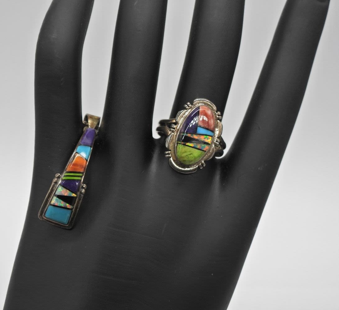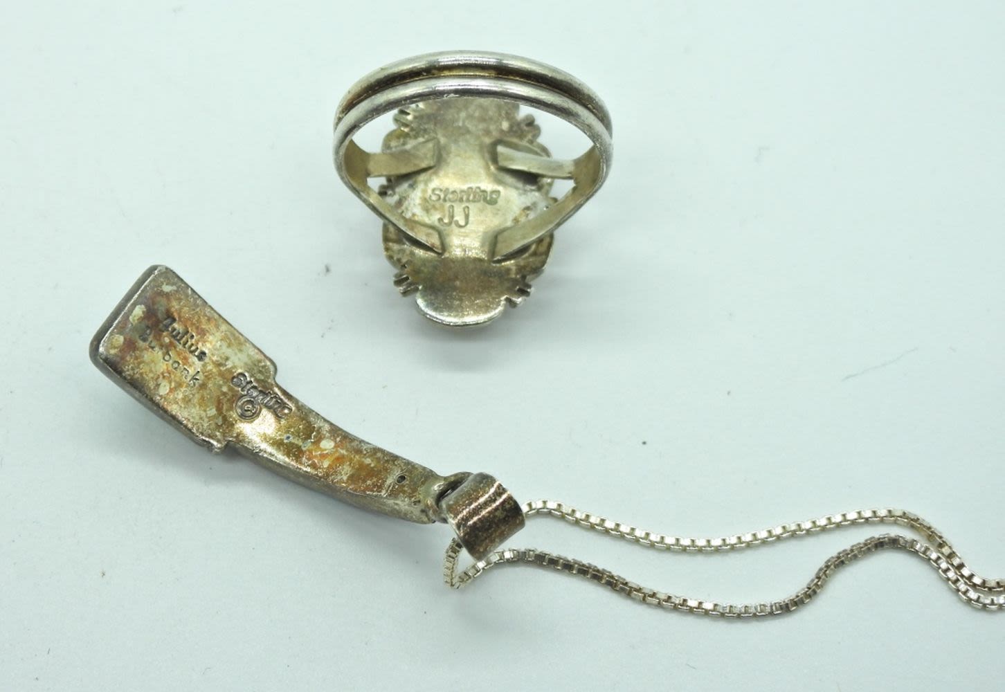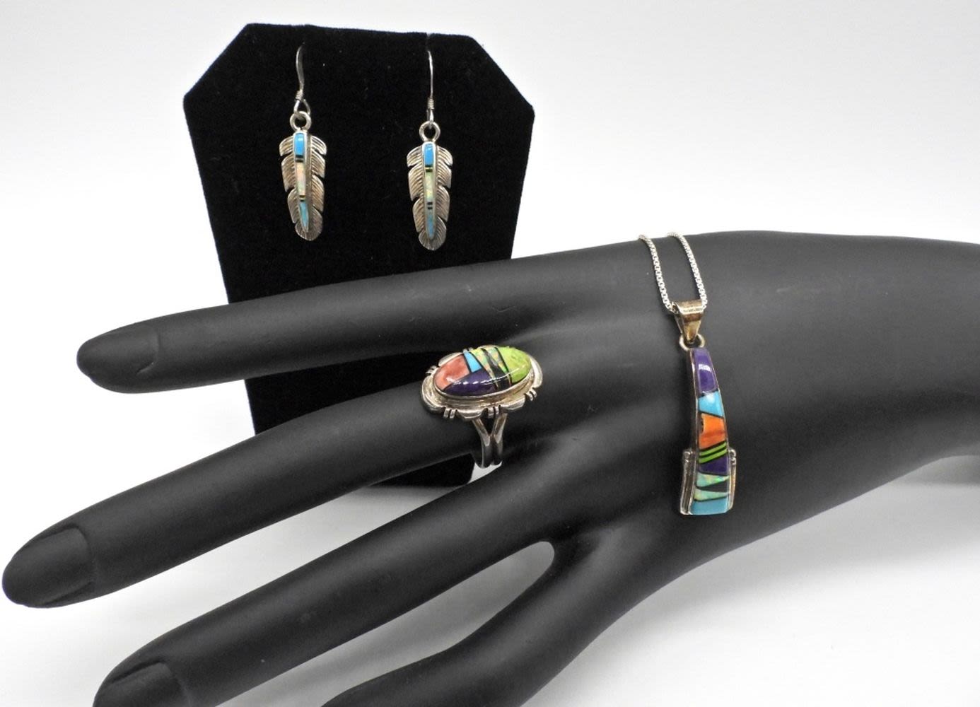Julius Burbank pendant necklace with 16 inch 925 chain, oval ring size 9, and feather earrings. This set is stunning. (9.9 DWT)
