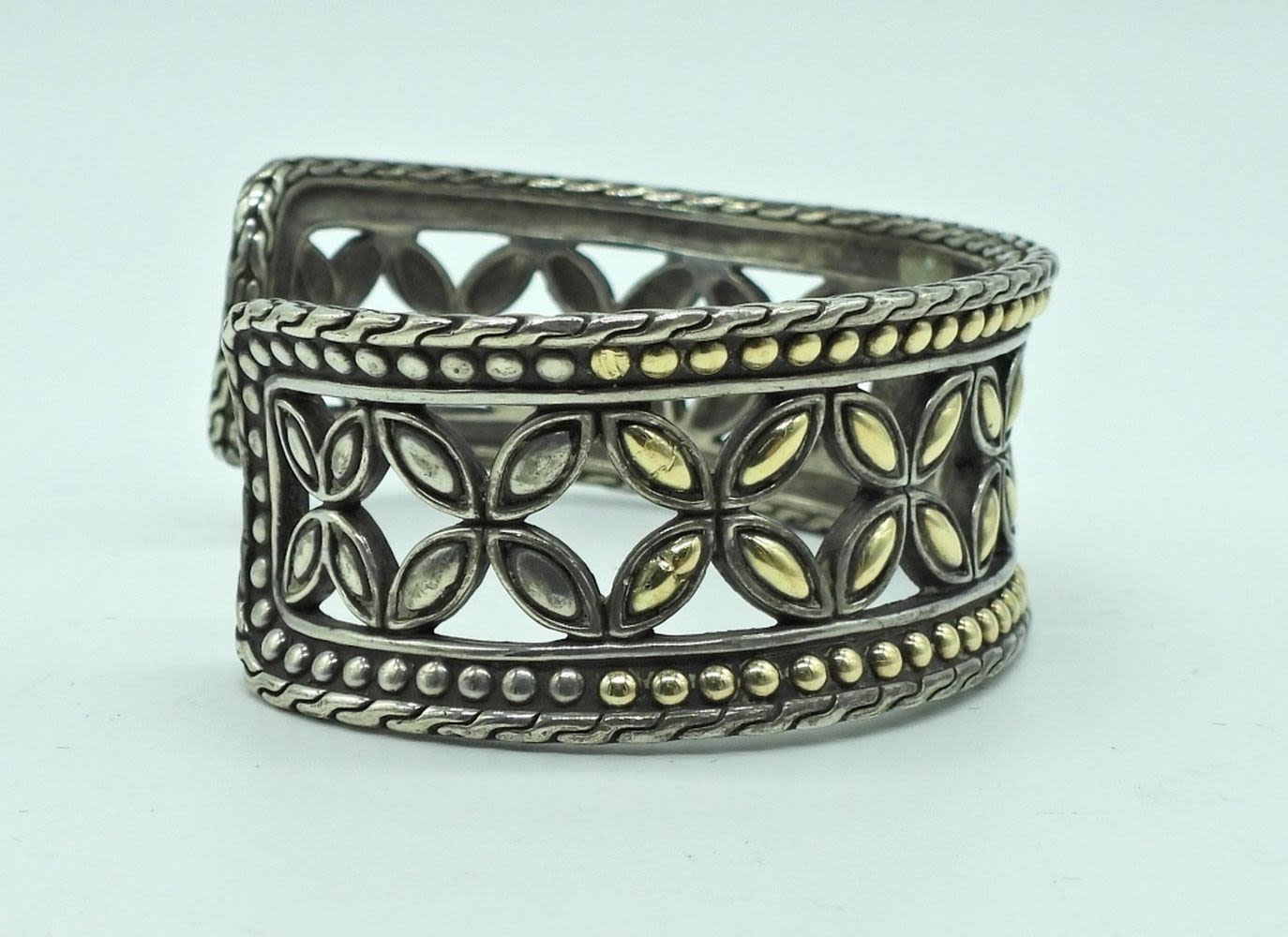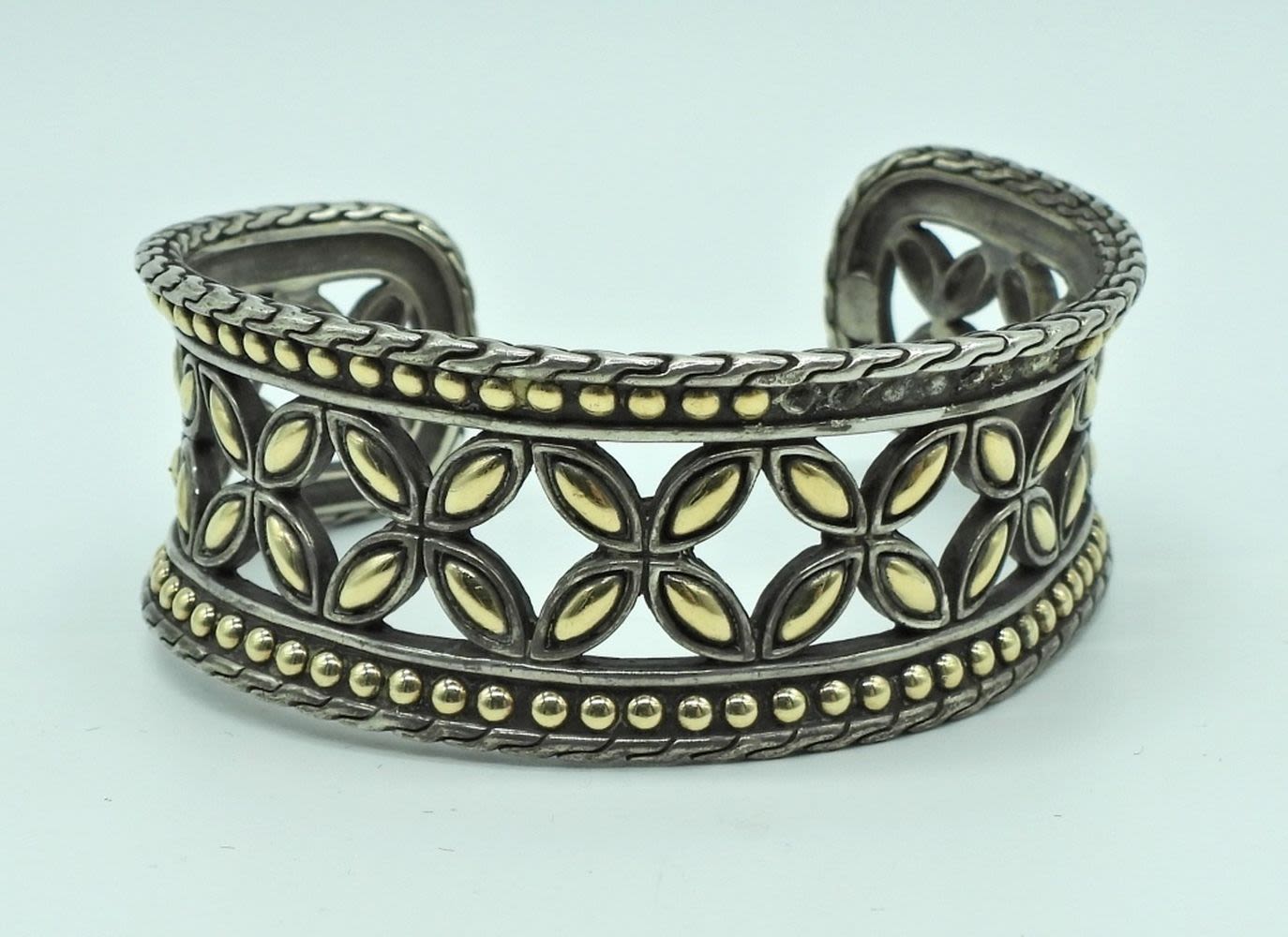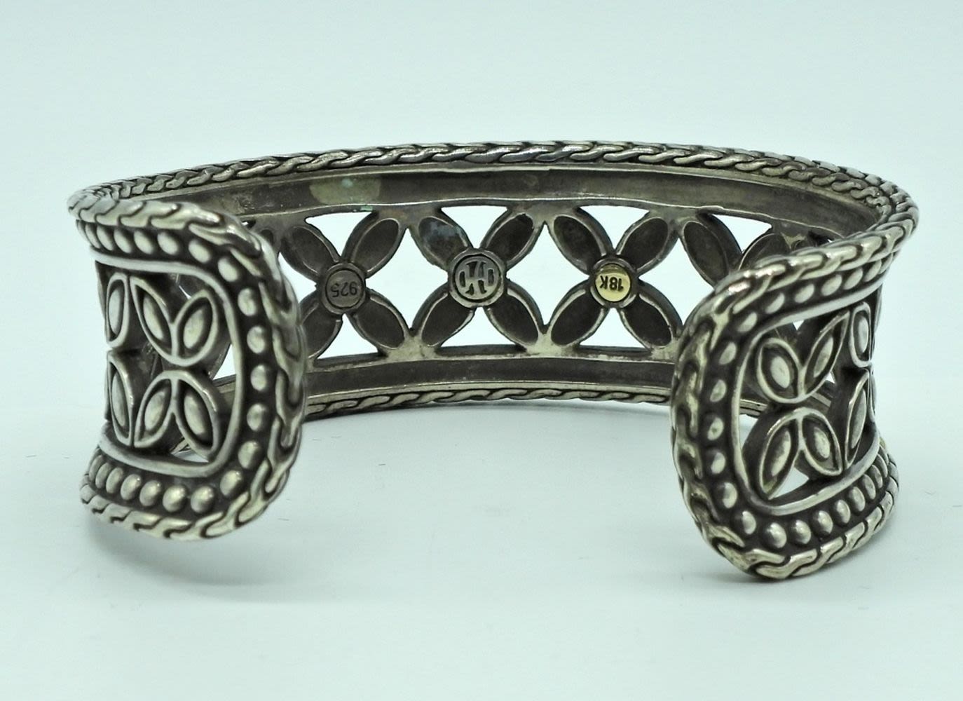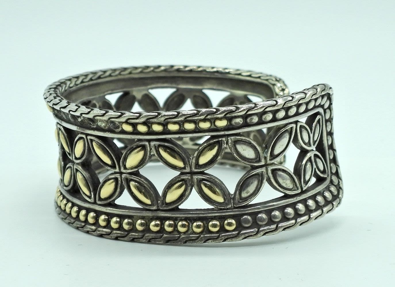 sterling with 18k inserts. Roman floral patten. Has a small unnoticeable file mark in one side. (32.4 DWT)