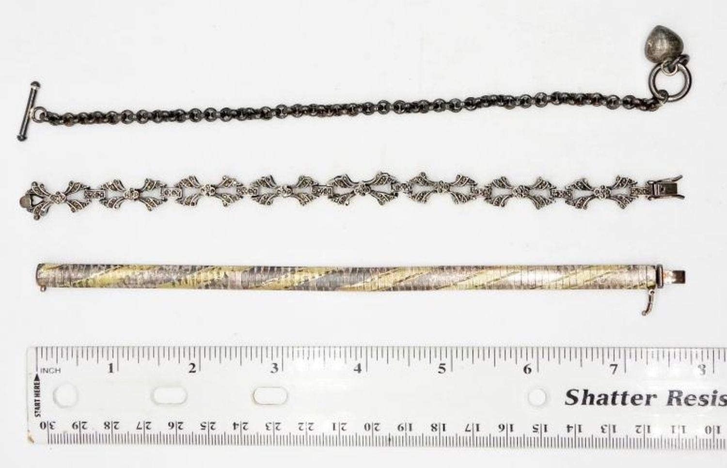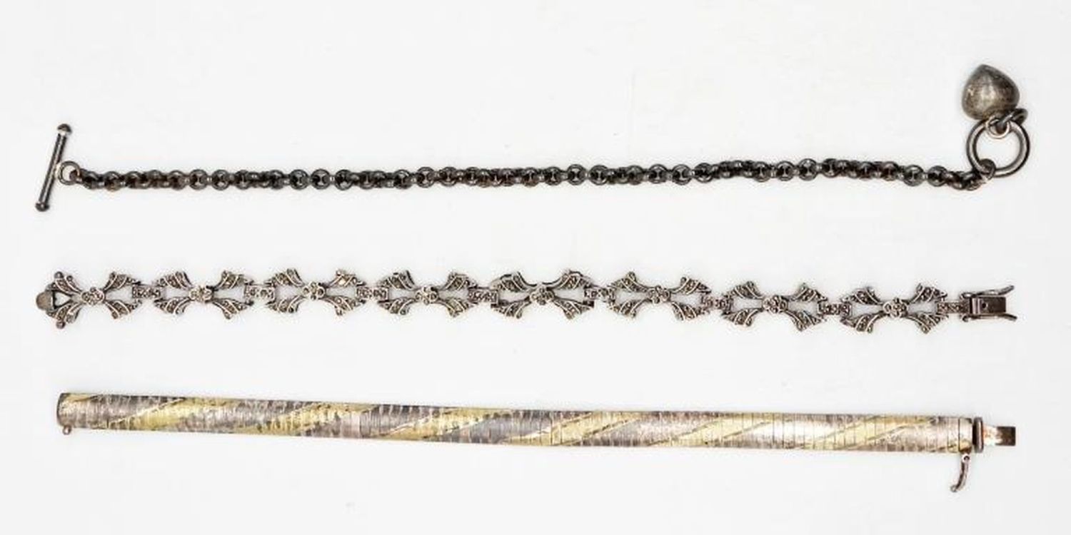 (2) 7.5″, (1) 8.5″ STERLING SILVER BRACELETS, MARCASITE, HEART CHARM; STAMPED 925, 925 ITALY; 30 DWT