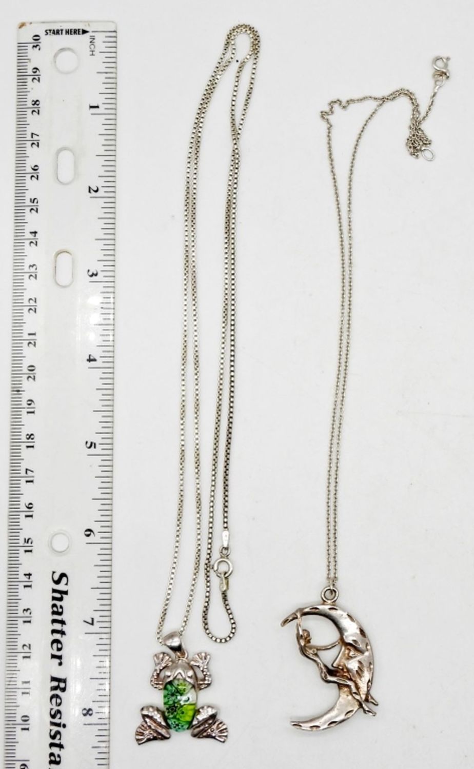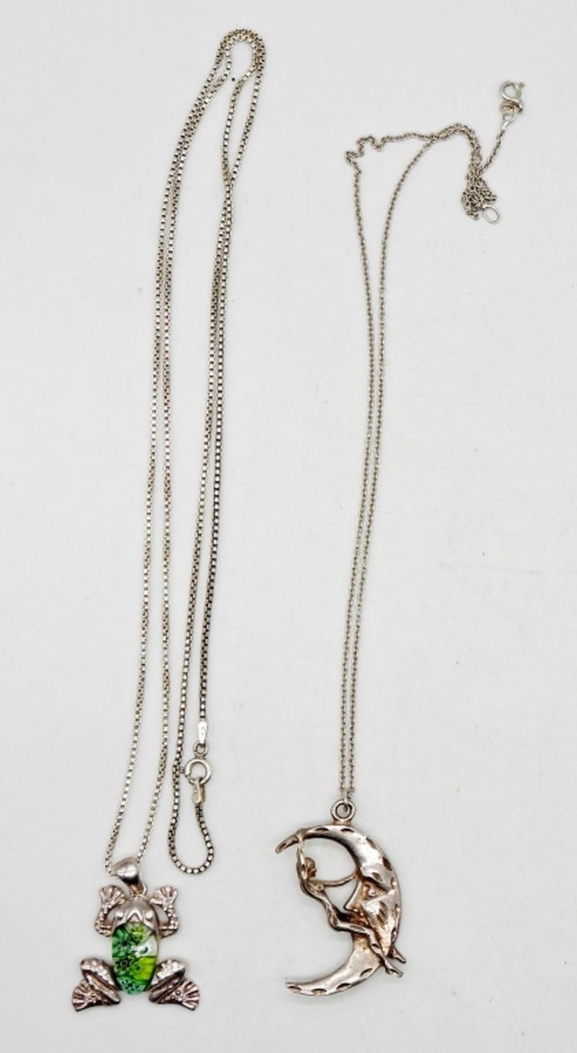 WITH STERLING SILVER PENDANTS, FROG & MOON; 18″ & 30″ CHAIN LENGTHS; STAMPED “FAS ITALY 925” & “925 ITALY”; 15.5 DWT