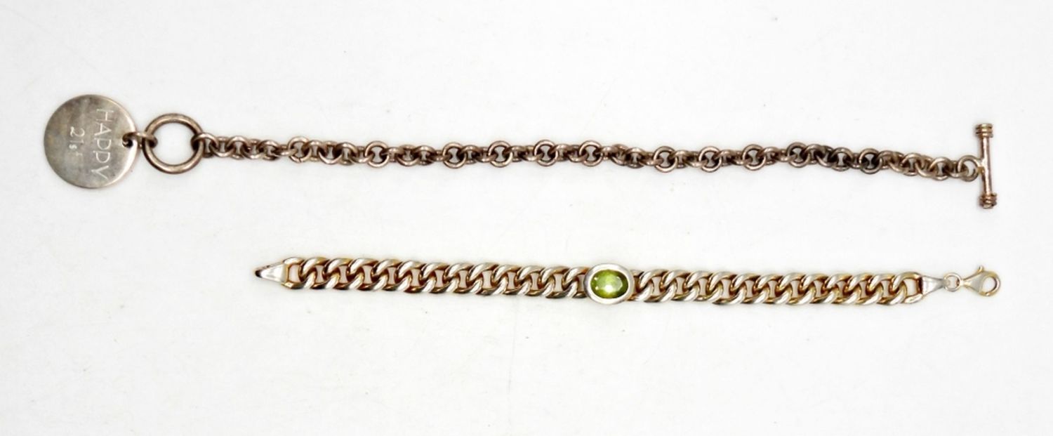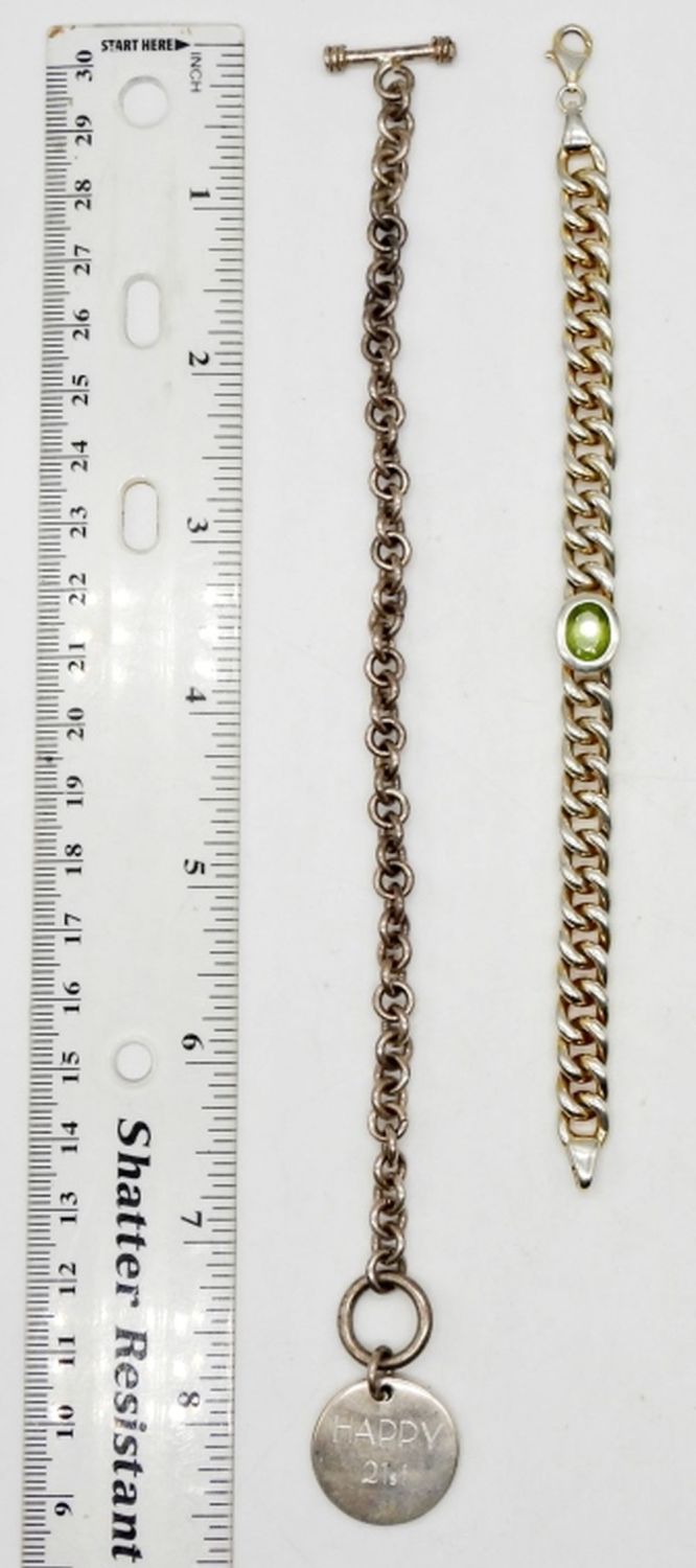 6.5 INCH STERLING SILVER CHAIN BRACELET WITH GREEN CENTER GEMSTONE – STAMPED 925; 8 INCH SILVER STERLING CHAIN BRACELET WITH ENGRAVED CIRCLE CHARM – STAMPED 925; 28.6 DWT