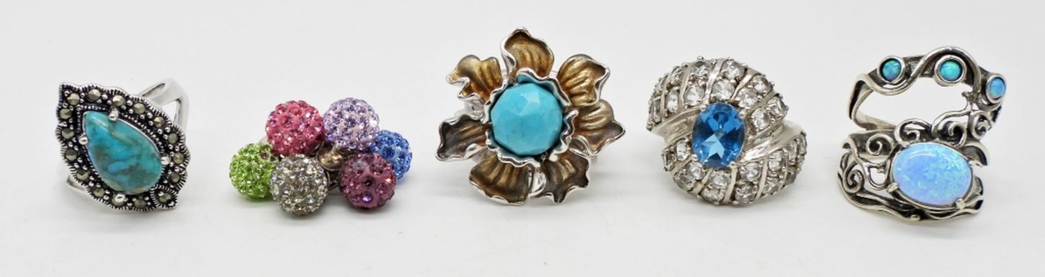 STERLING SILVER BLING FASHION RINGS WITH TURQUOISE NATURAL STONES & GEMSTONES; SIZES VARY 6-8.5; STAMPED 925, 925 CHINA; 24.5 DWT