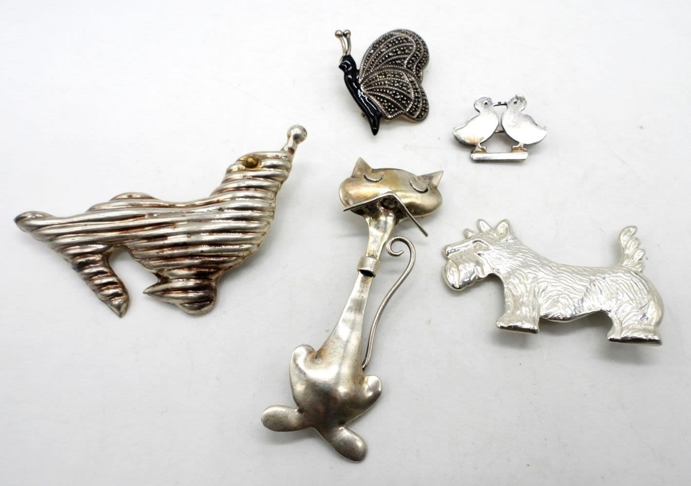 28.4DWT, 1- CAT 2 1/2″ STAMPED MEXICO TAXCO 925, 1- SEAL 2 1/2″ LONG STAMPED TS-01 925, 1-MARCASITE BUTTERFLY STAMPED STERLING,1″ LONG, 1- DOG 2IN” LONG STAMPED STER, 1- BABY CHICKS STAMPED STERLING DOSKOW