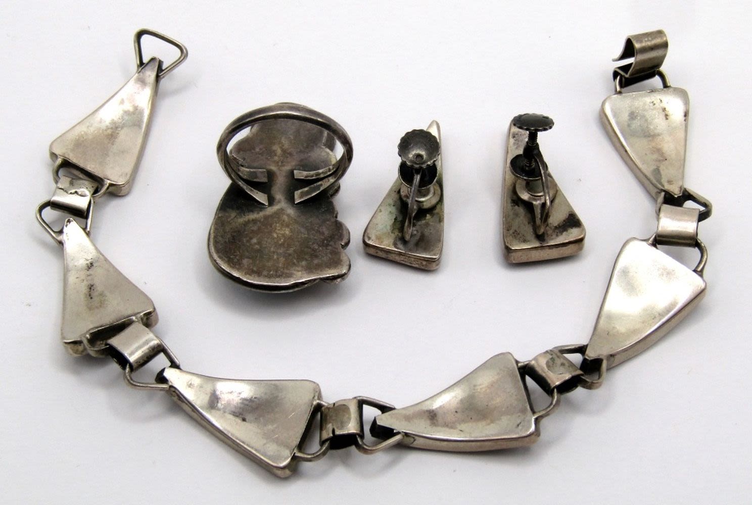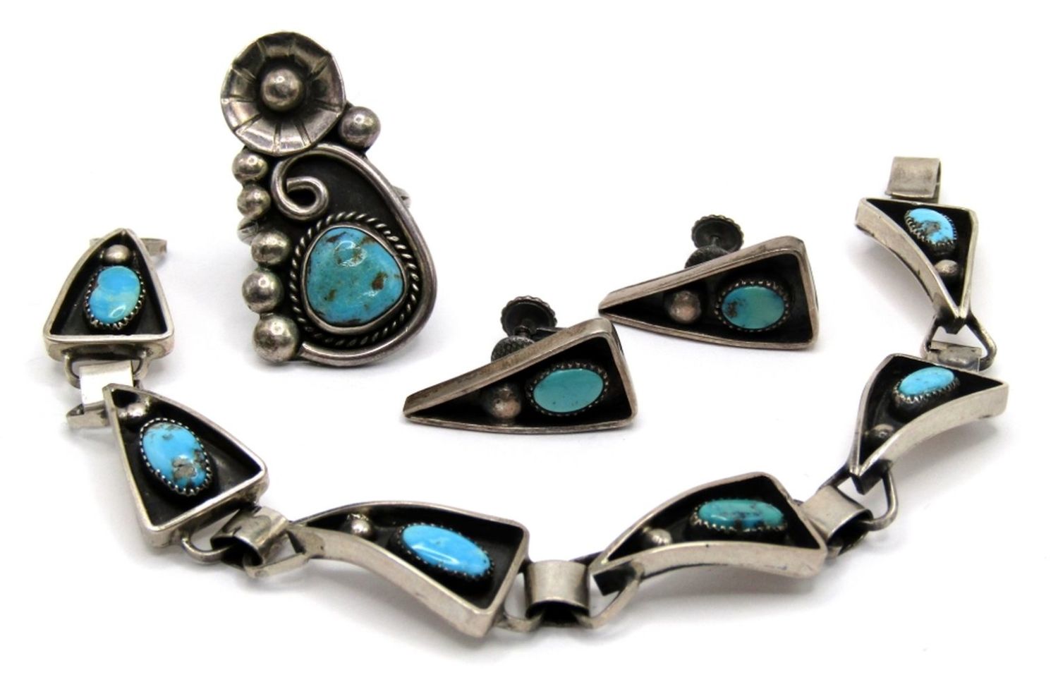 SCREW-BACK EARRINGS, 7 1/4″ BRACELET, SIZE 5 RING – BEAUTIFUL TURQUOISE STONES ((21 DWT)