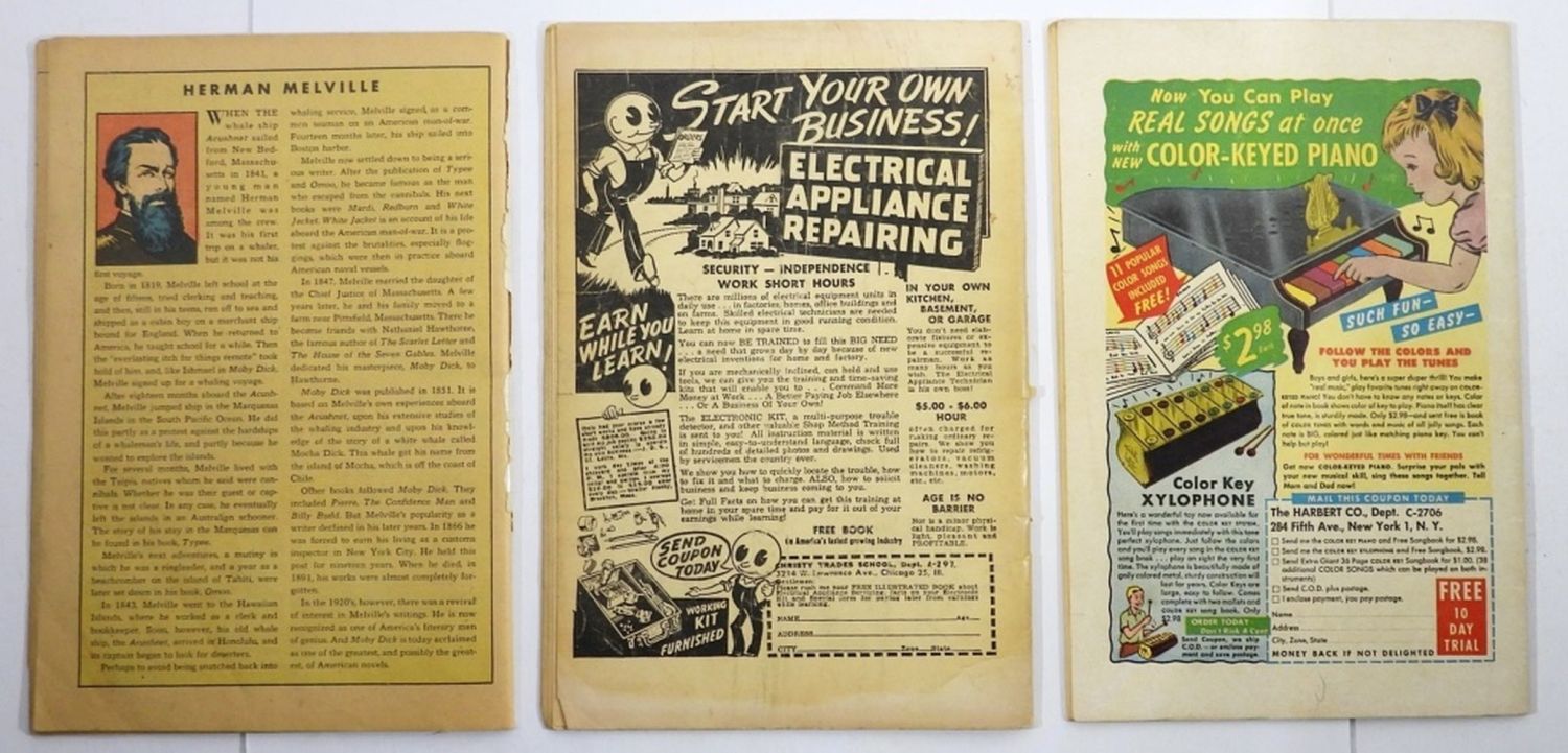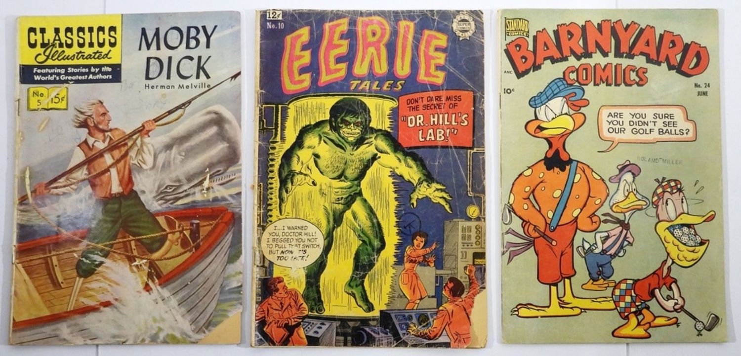 1963 Eerie Tales #10, 1949 Barnyard Comics #24, 1945 Classics Illustrated Moby Dick #5 (Missing Back Cover); As Is/Poor Conditions.