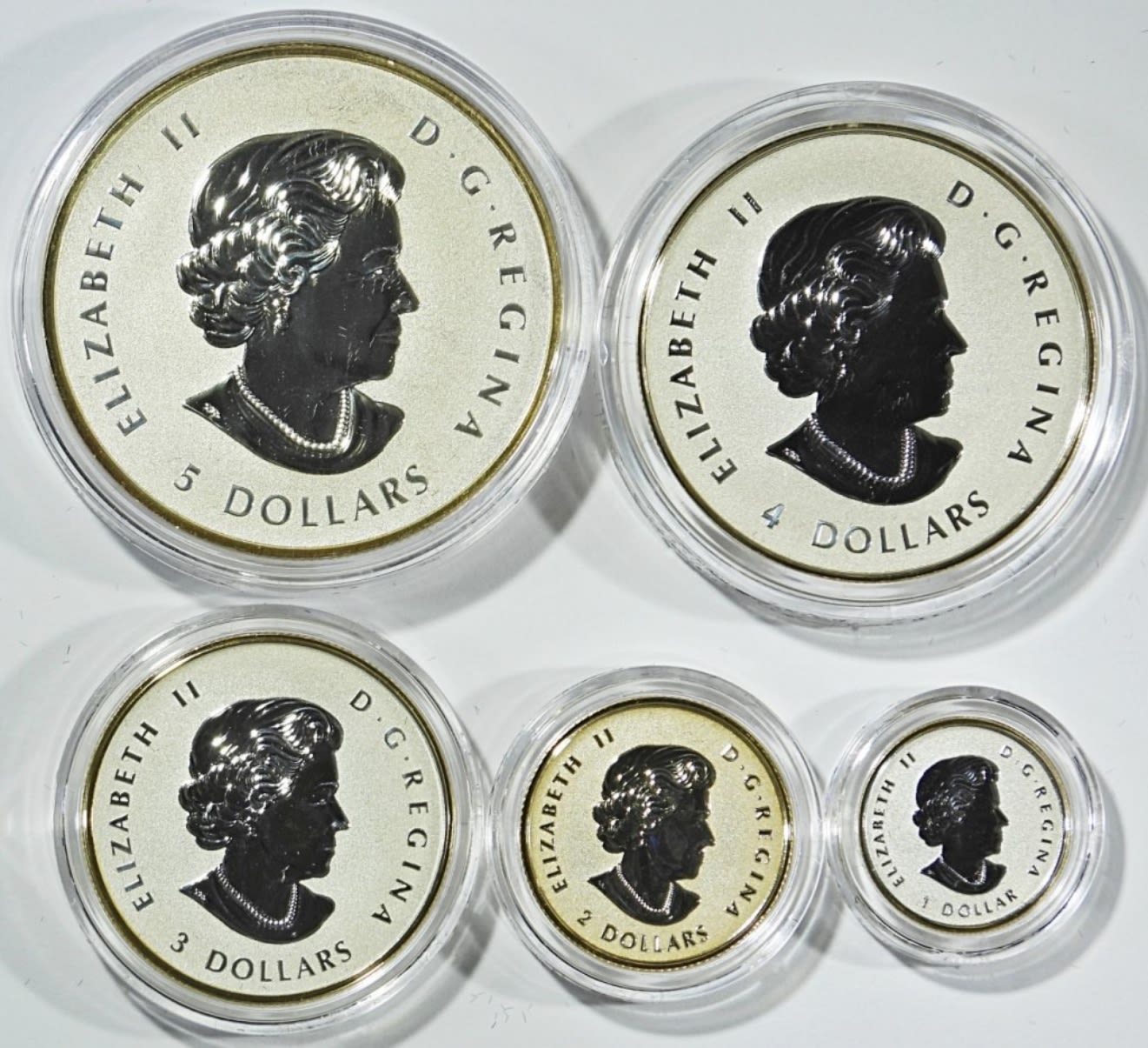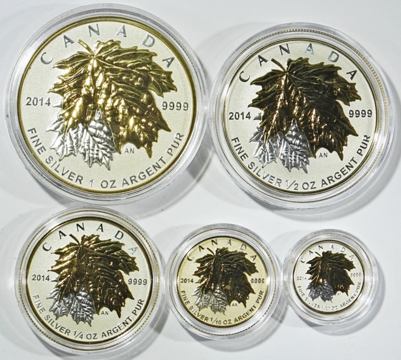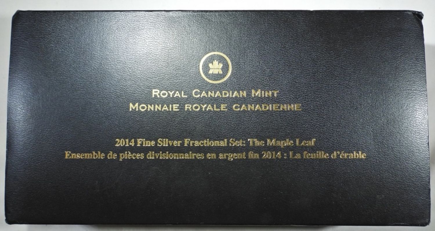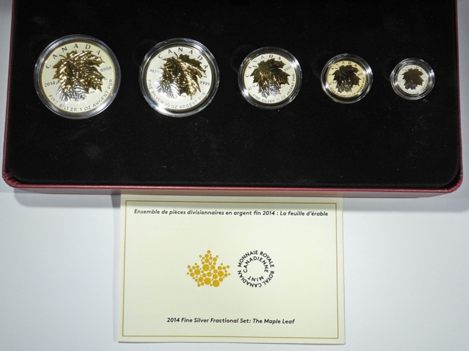 5-COIN FINE SILVER FRACTIONAL SET: THE MAPLE LEAF. REVERSE PROOF W/ GOLD PLATING. IN OGP W/ COA. INCLUDES 1oz, 1/2oz, 1/4oz, 1/10oz, & 1/20oz. (1.9oz .999 SILVER TOTAL)