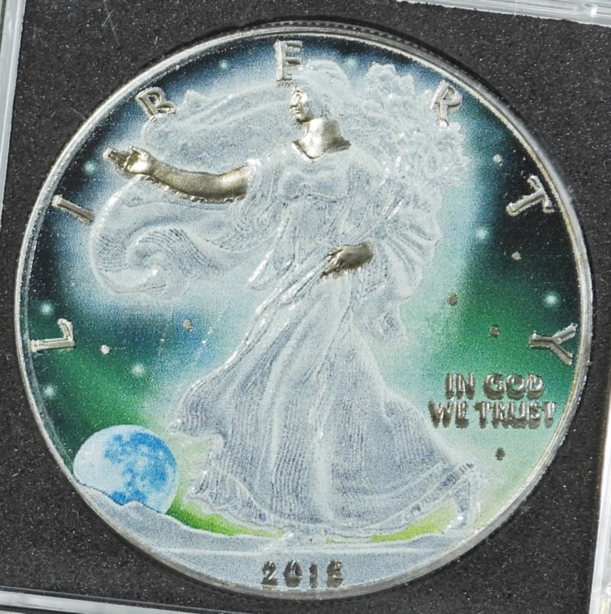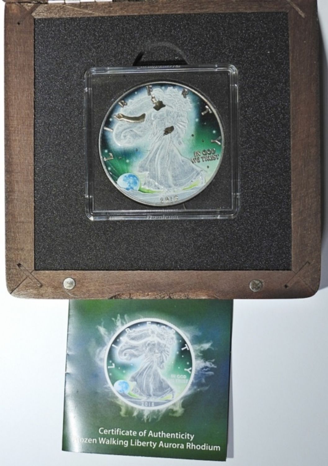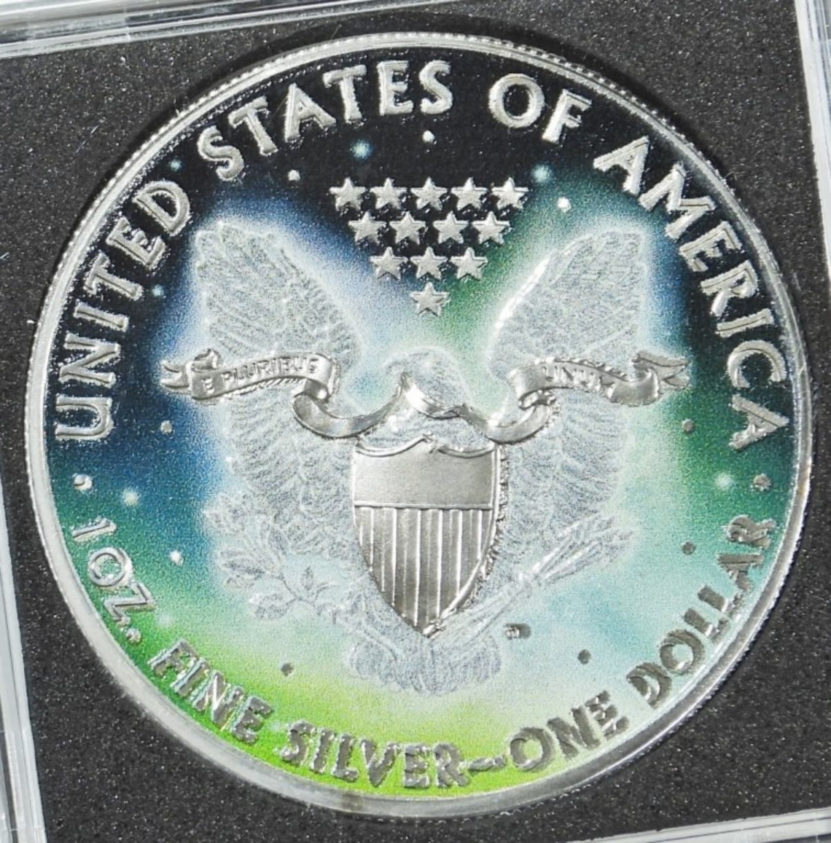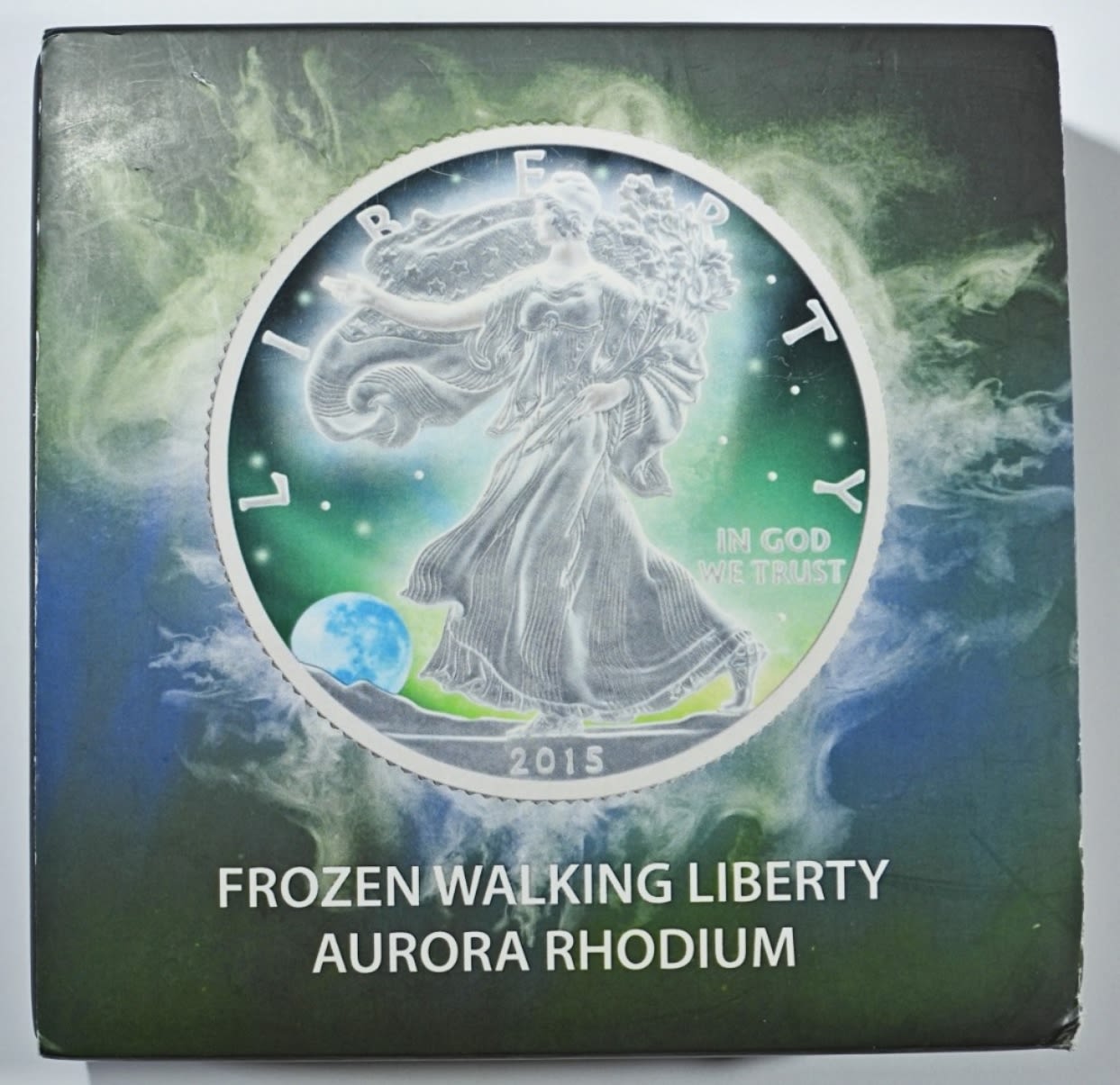 RHODIUM. AMERICAN SILVER EAGLE 1oz .999 SILVER WITH RHODIUM & UV PRINTING FINISH. IN BOX W/ COA.