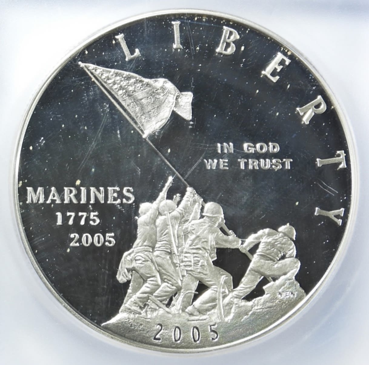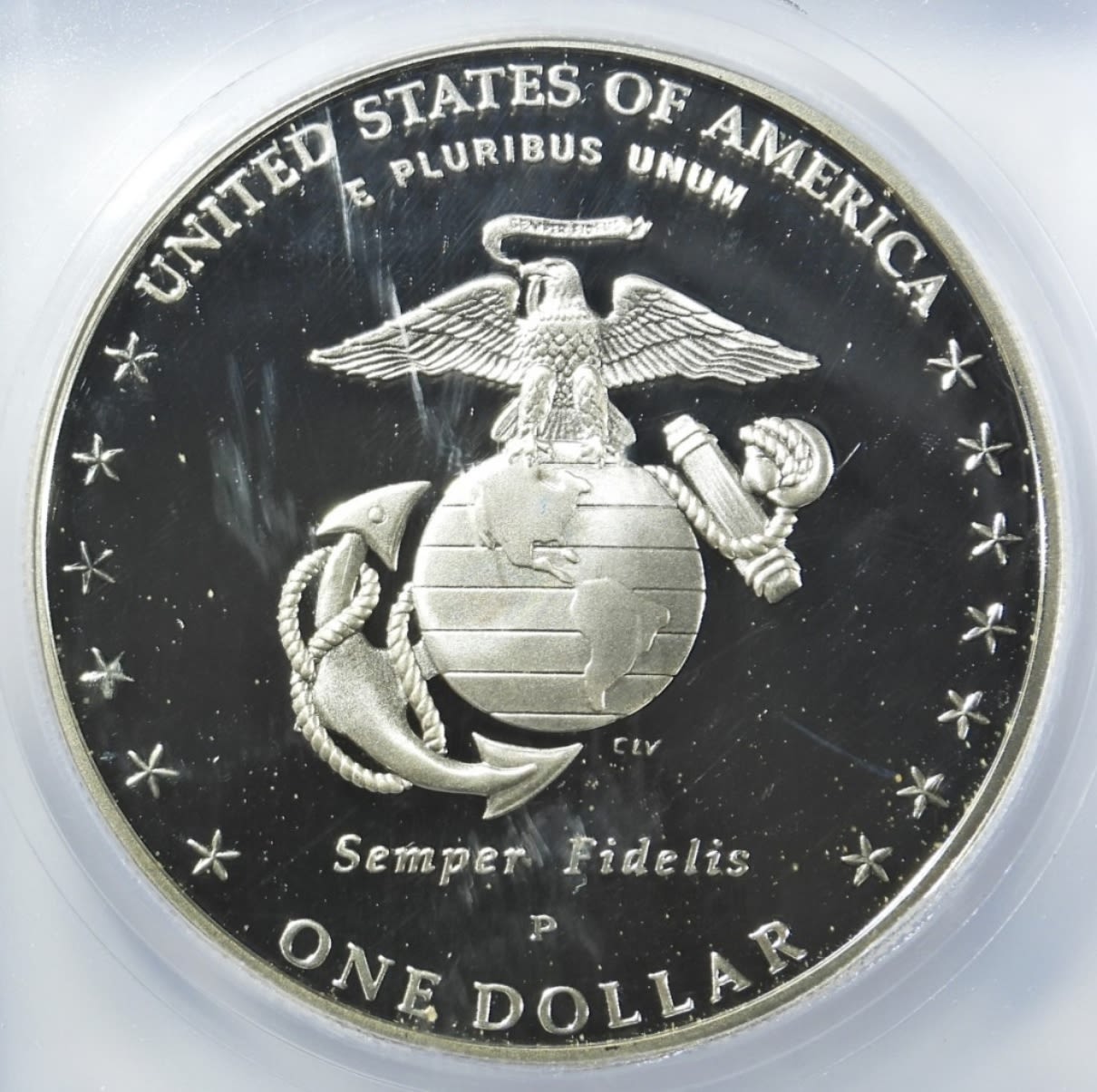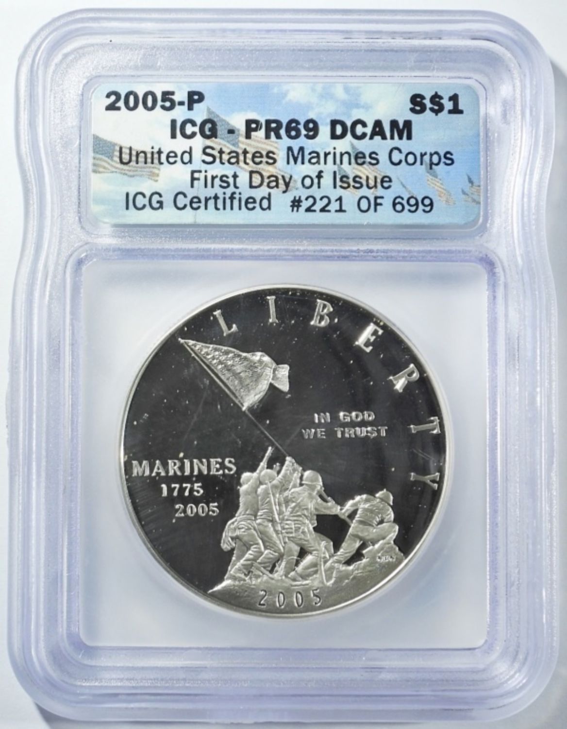 FIRST DAY OF ISSUE. MARINE CORPS COMMEM SILVER DOLLAR