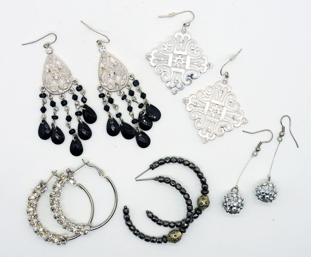 One silver tone square pair, one silver tone and black tear drop dangle pair, one sparkling ball drop pair, one white rhinestone closed hoop pair, and one faux hematite open hoop pair.