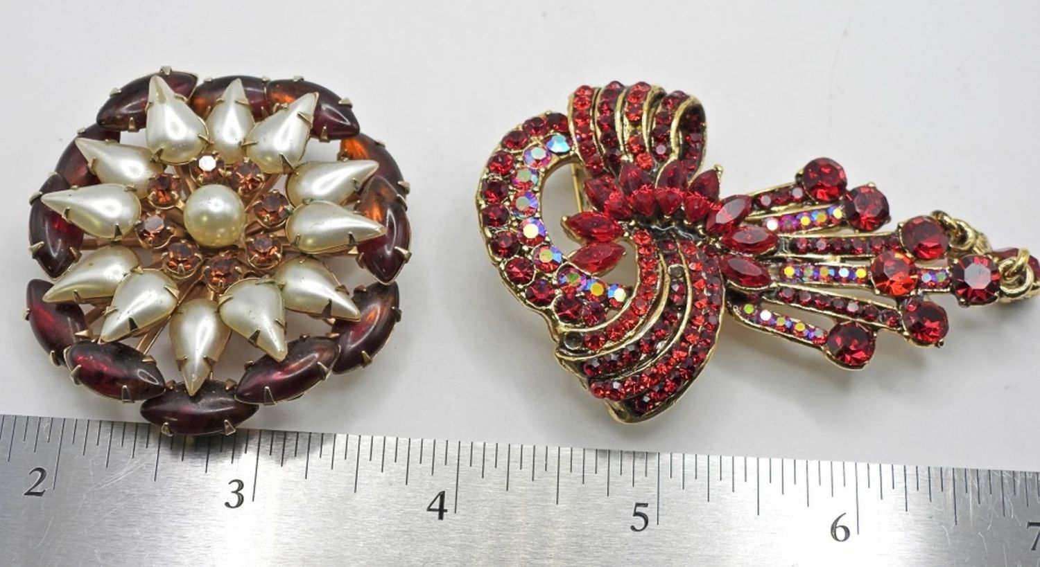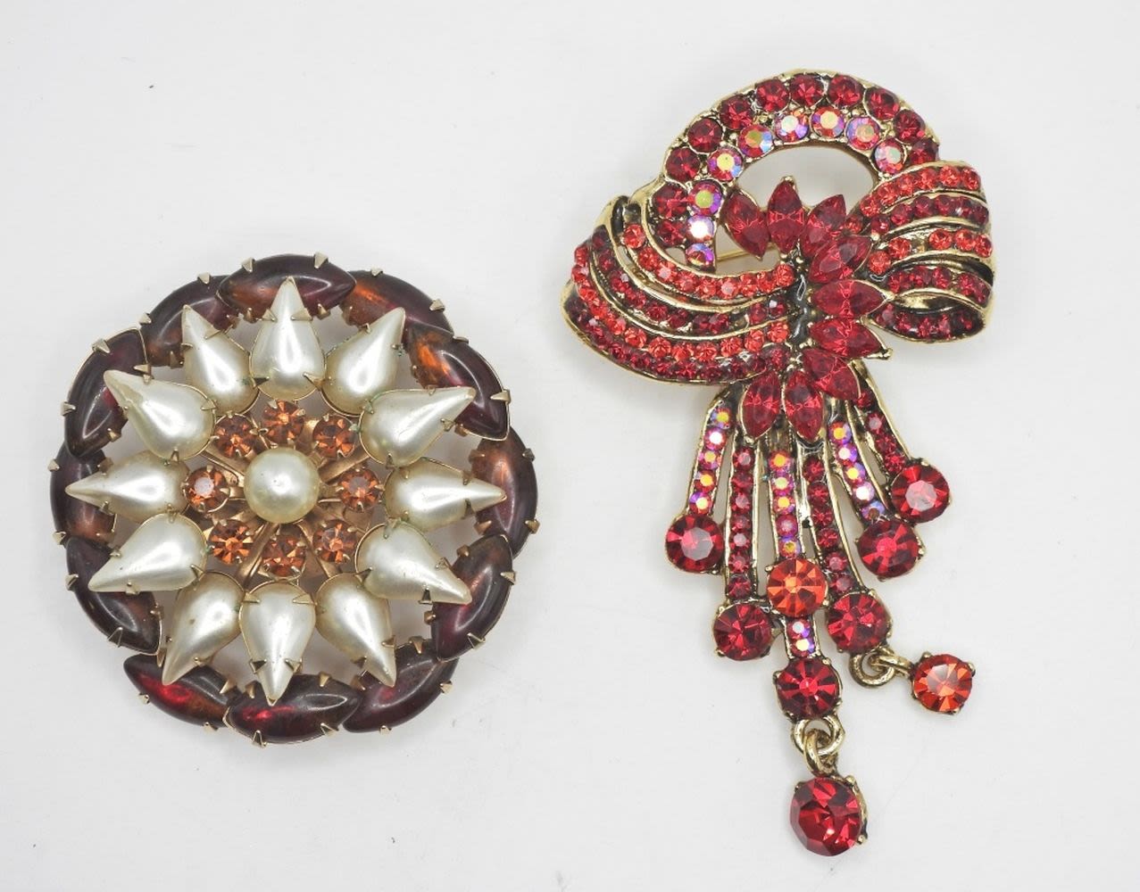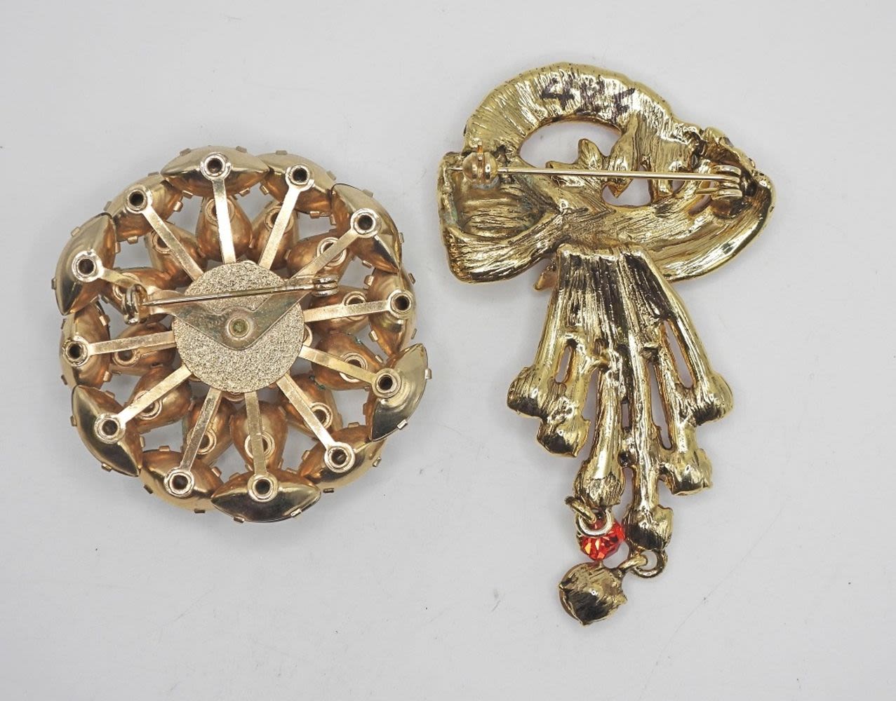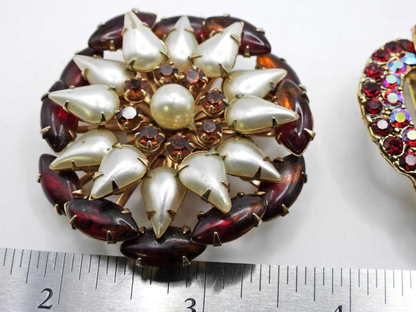ROOTBEER COLORED CIRCLE BROOCH & DARK RED RHINESTONES BROOCH missing (2) gems hard to notice