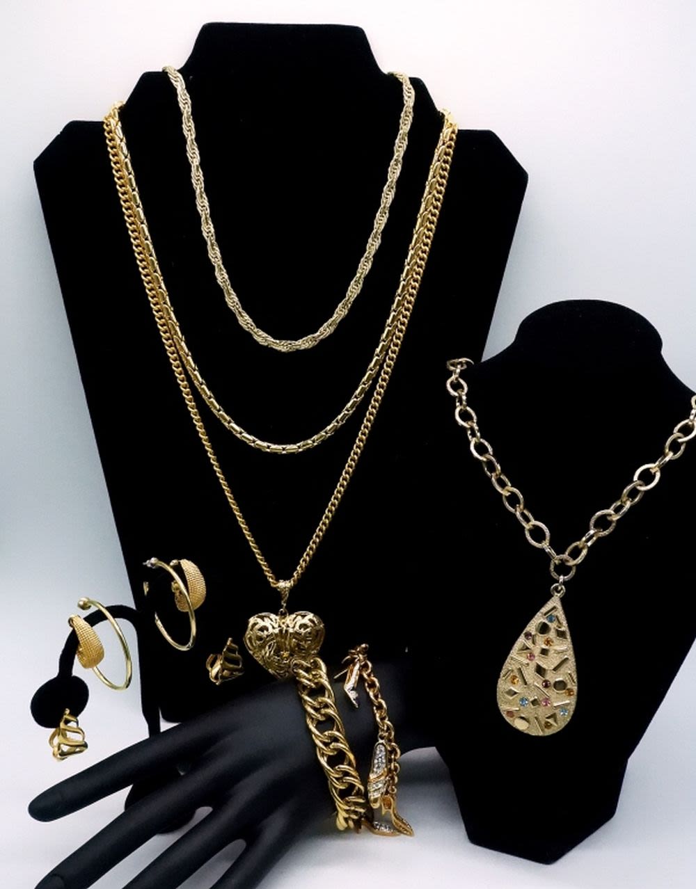 Necklaces 17″ (Sarah Coventry), 18″ & 34″. Bracelets 7″. Three pairs of earrings. Very nice!