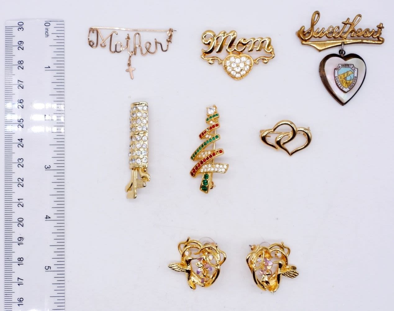 GOLD TONE BROOCHES ALL DIFFERENT – RHINESTONES, MOTHER, MOM, SWEETHEART, HEARTS; GOLD TONE EARRINGS WITH HUMMINGBIRDS & RHINESTONES
