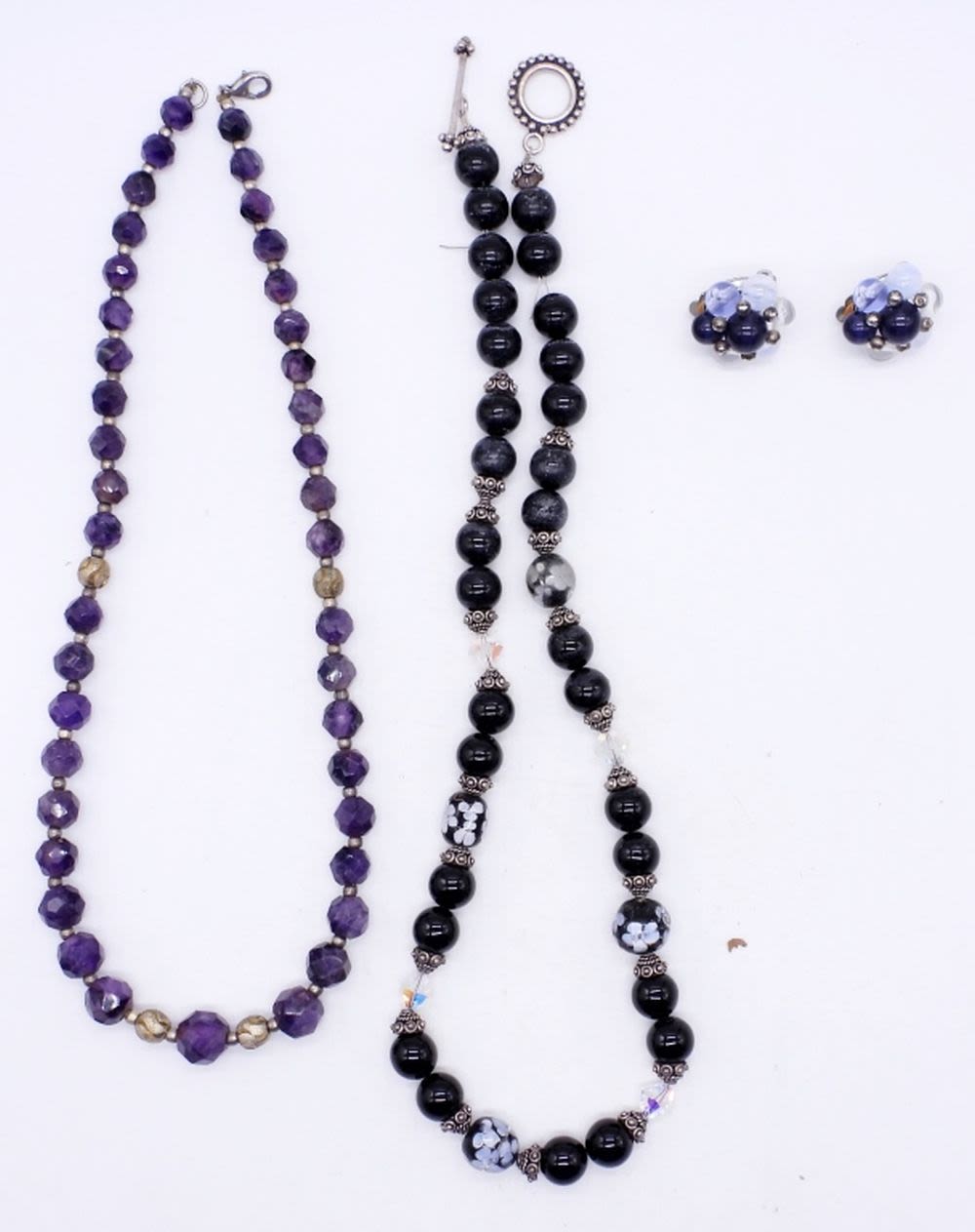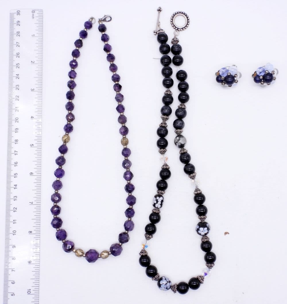 GLASS BEADS, CLEAR PURPLE & BLACK STONES, 19″ & 20″ LENGTHS; MATCHING CLIP-ON EARRINGS WITH SMOOTH NATURAL STONES