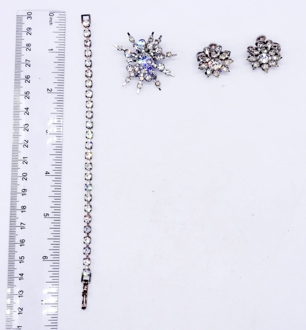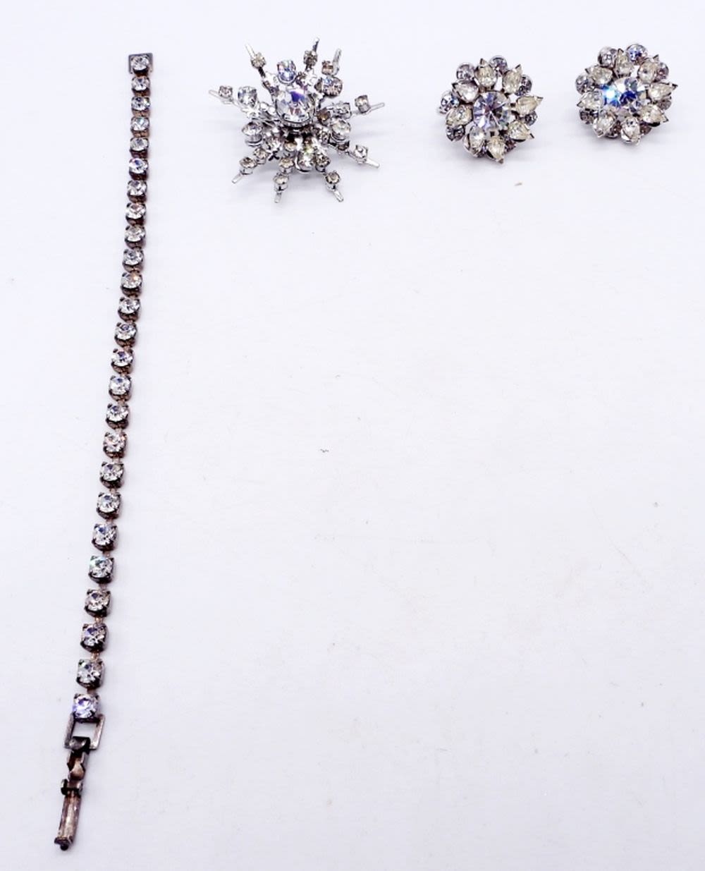(1) PAIR OF SCREW-BACK EARRINGS; (1) ANTIQUE BROOCH; (1) 6.5″ BRACELET; WITH CLEAR GEMSTONES