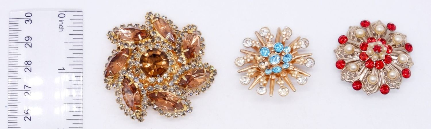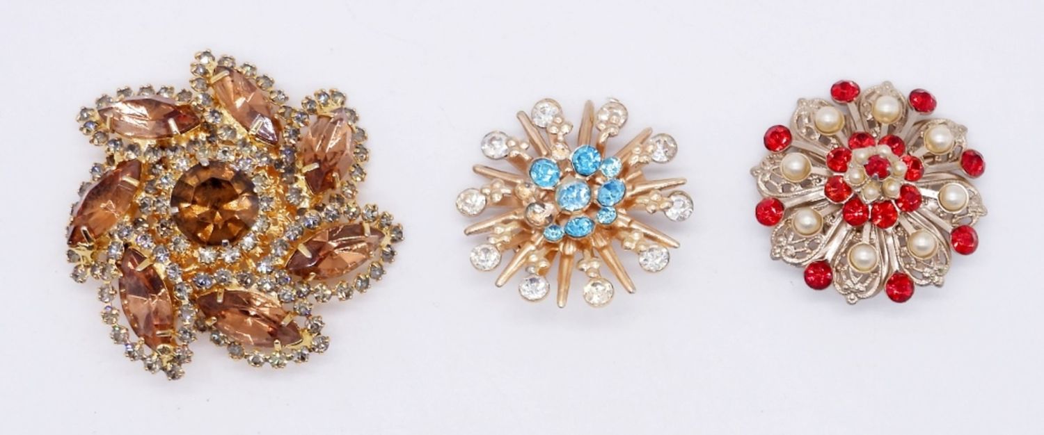 GOLD TONE ANTIQUE BROOCHES WITH GEMSTONES OF AMBER, BLUE, RED & CLEAR, ALSO FAUX PEARLS