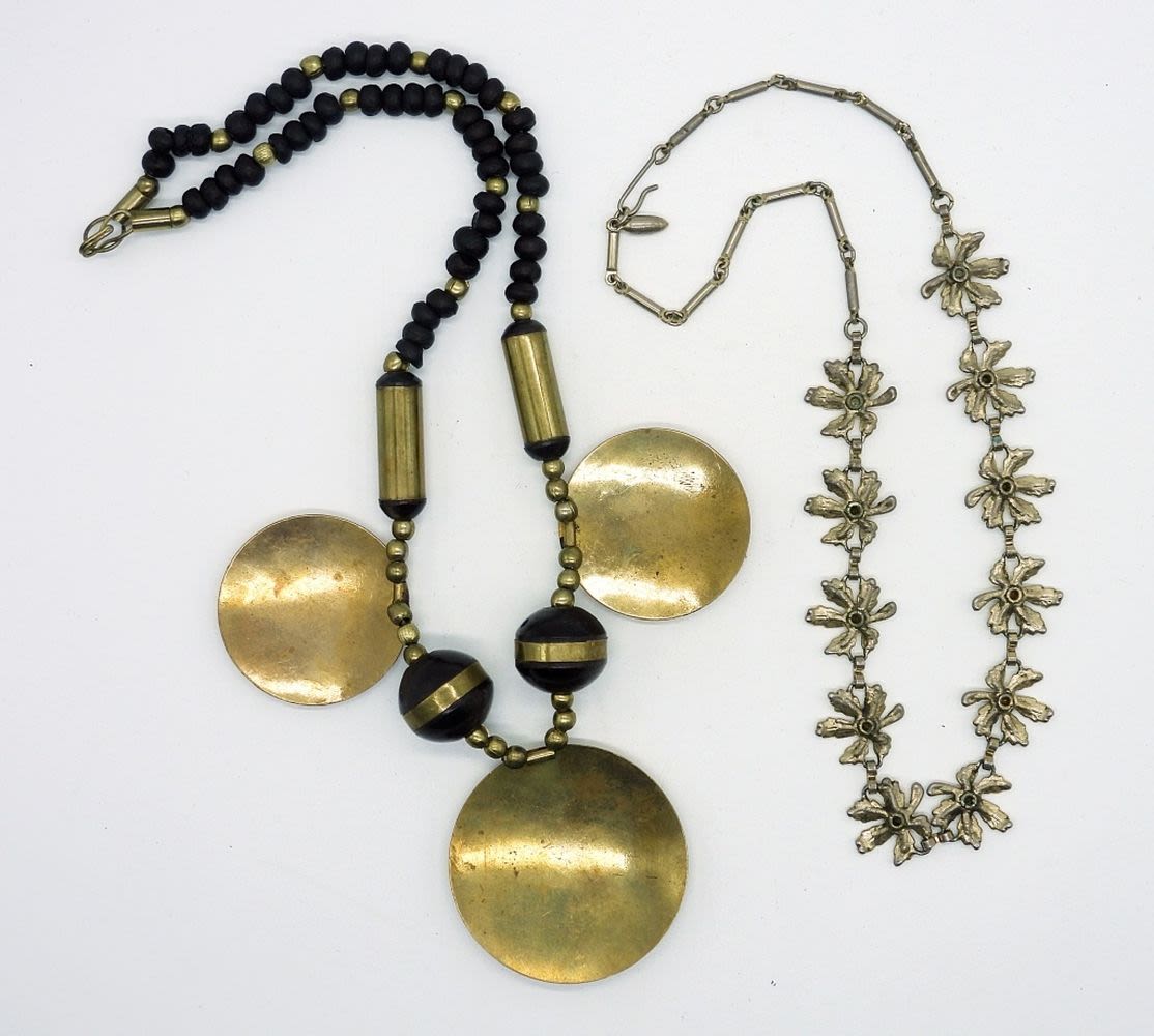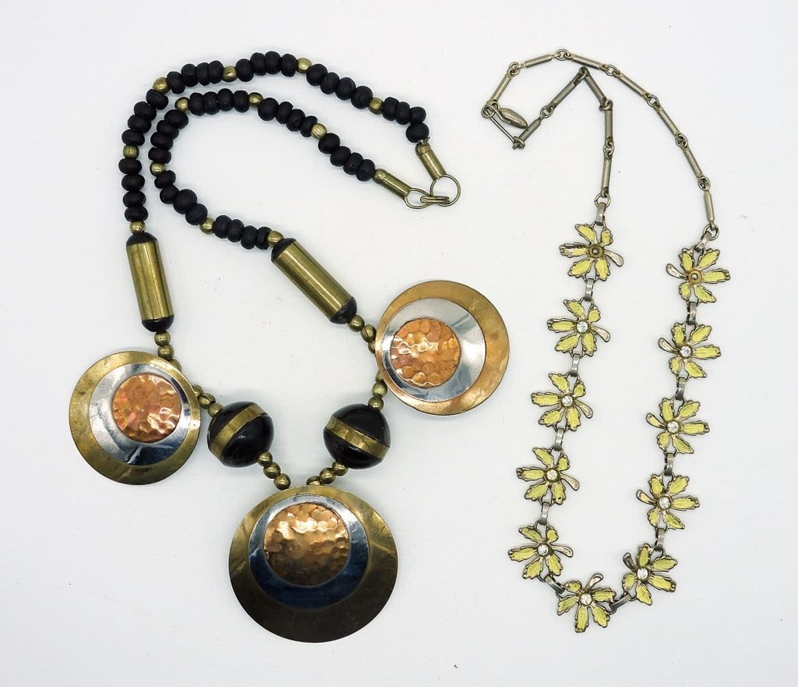 One 18 inch black wood beaded necklace with gold tone and hammered copper tone metal disc beads, and one 17 inch gold tone necklace with white rhinestones, and yellow enamel flowers.