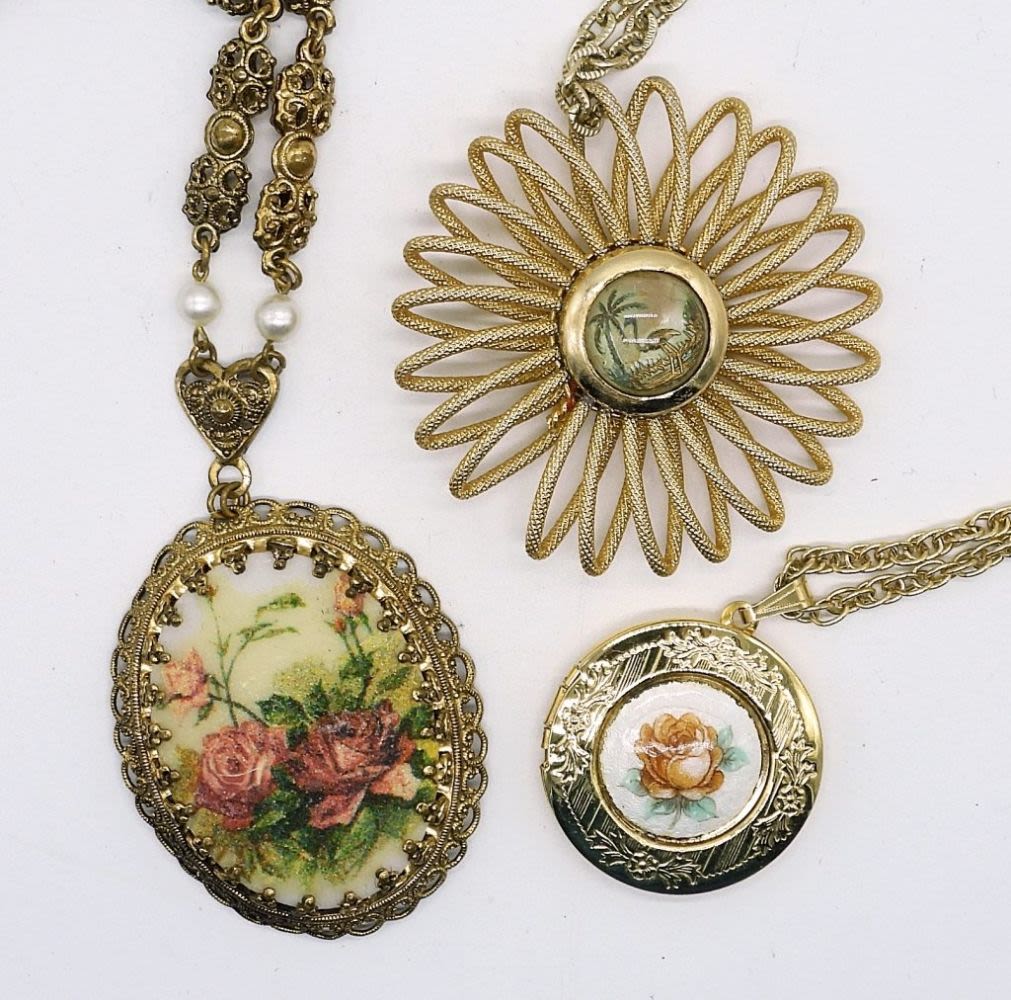 One gold tone West Germany sugared rose cameo on filigree 24 inch chain, one gold tone West Germany Guilloche peach rose enamel locket on 22 inch chain, and one gold tone West Germany Tropical Scene sun burst pendant tone