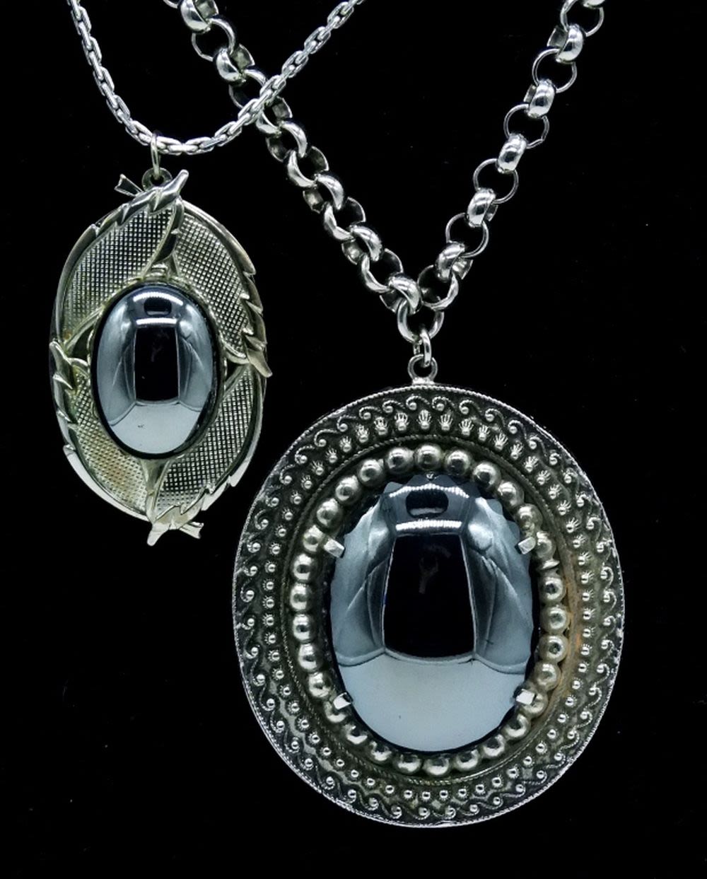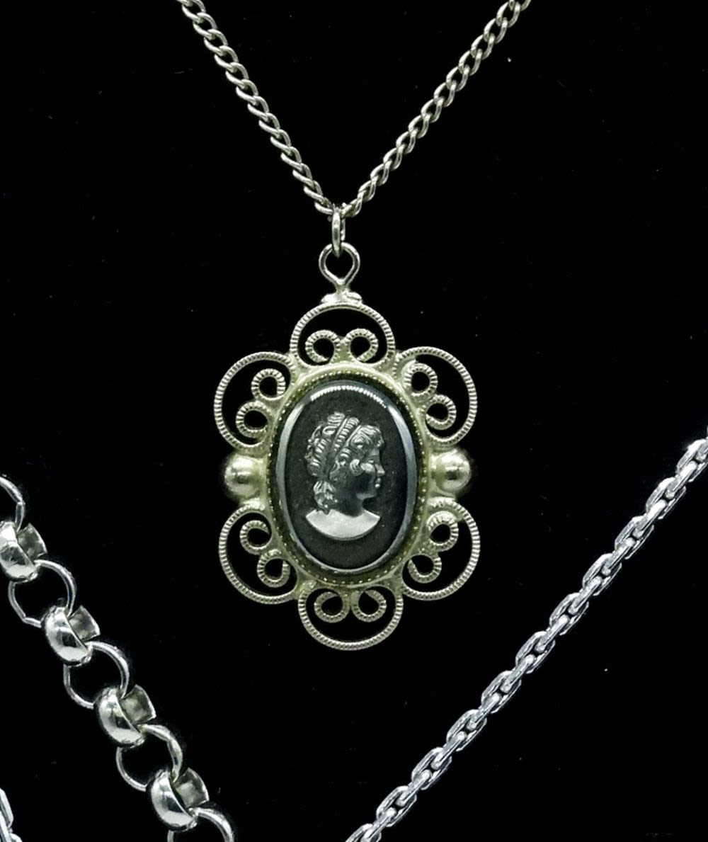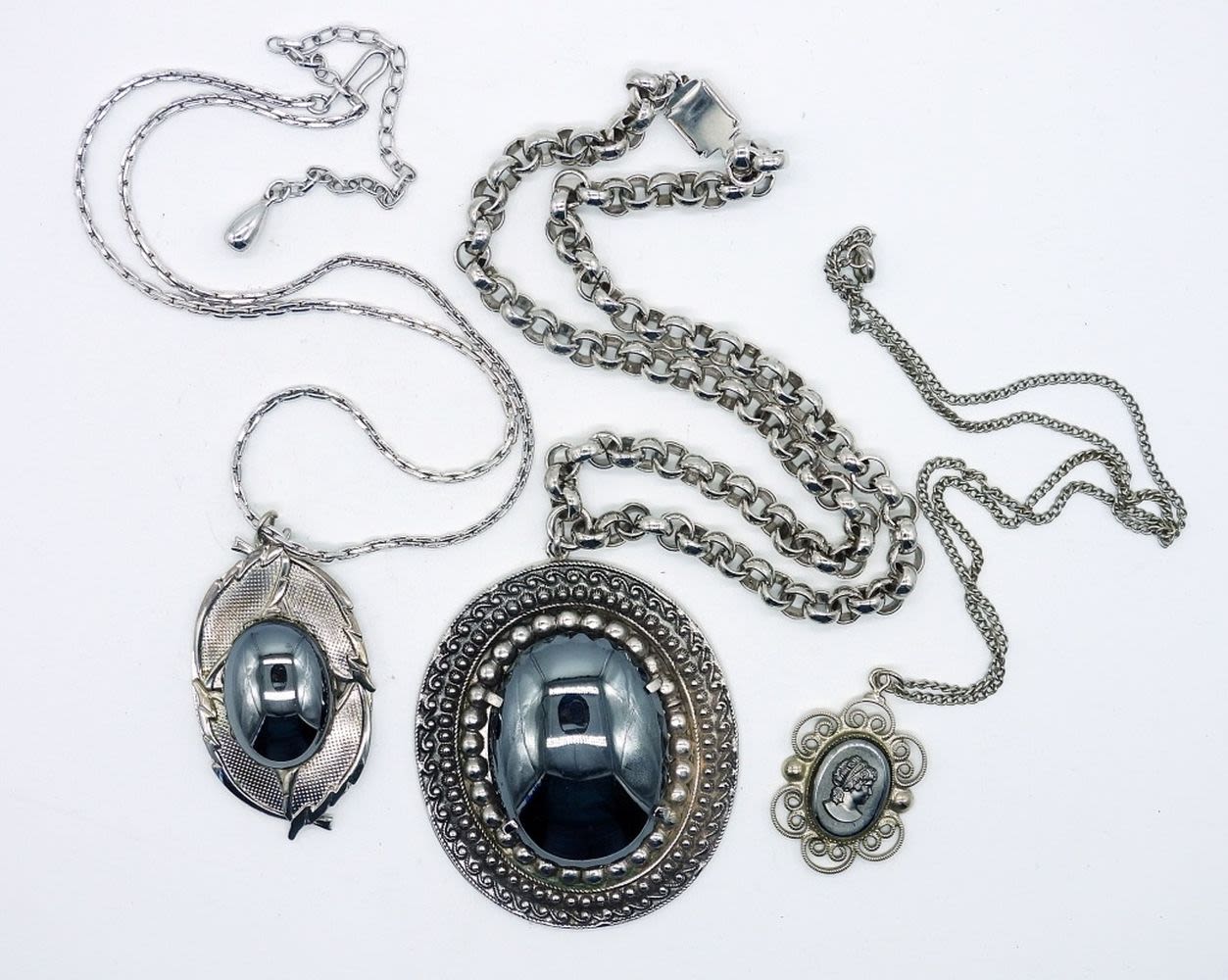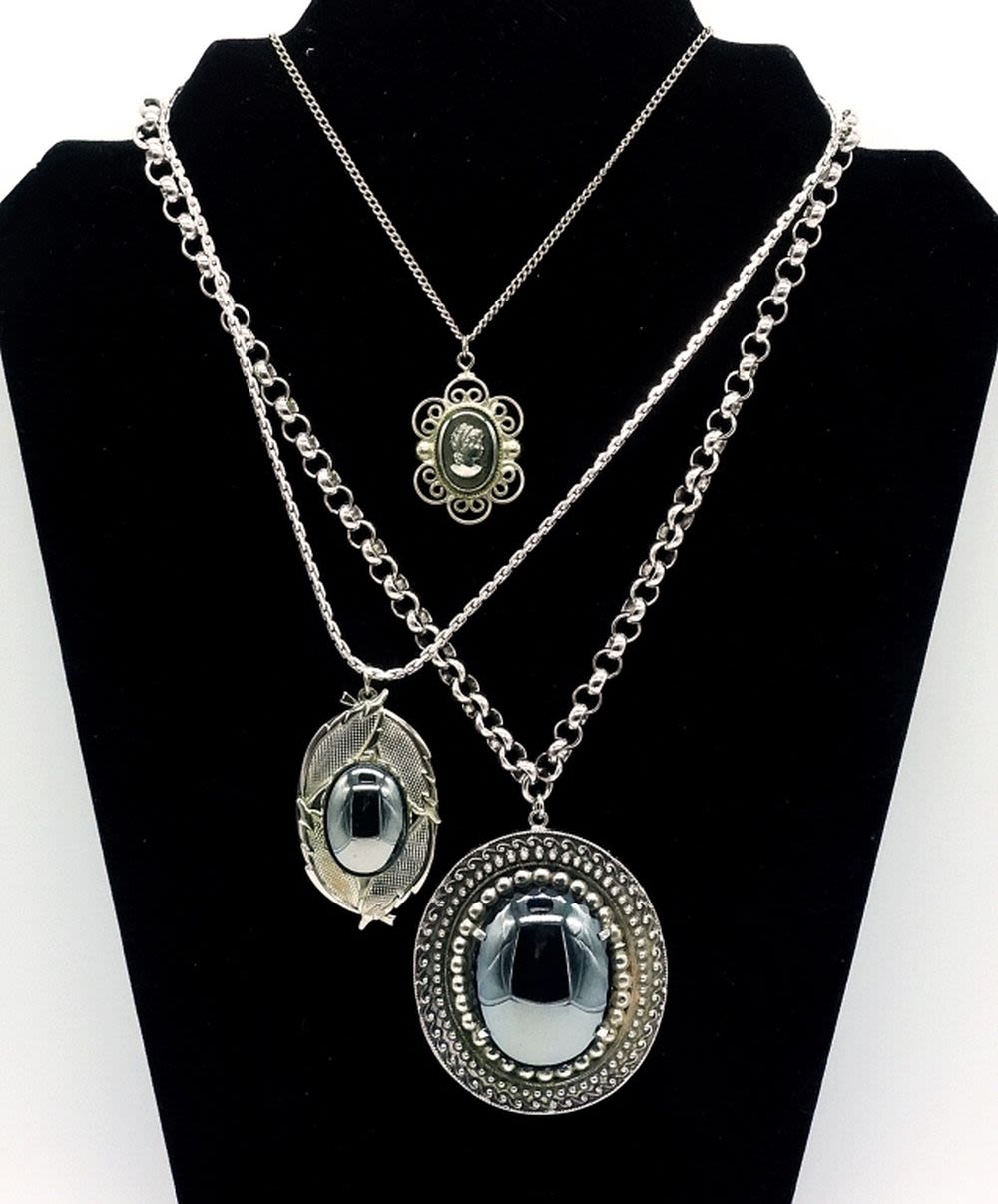 Whiting & Davis Co. hematite pendant necklace. Hematite stone measures 1 inch, total pendant length is 2 inches. Silver tone large rolo chain is 16 inches long. Pendant two is a 1 inch oval hematite stone pendant necklace. Total pendant length is 1.5 inches long. Chain is 16 inches with a 4 inch extender. Pendant three is a hematite carved cameo set in a filigree pendant. Stone measures just under 0.75 inches. Total pendant length is 1.25 inches. chain is 18 inches.