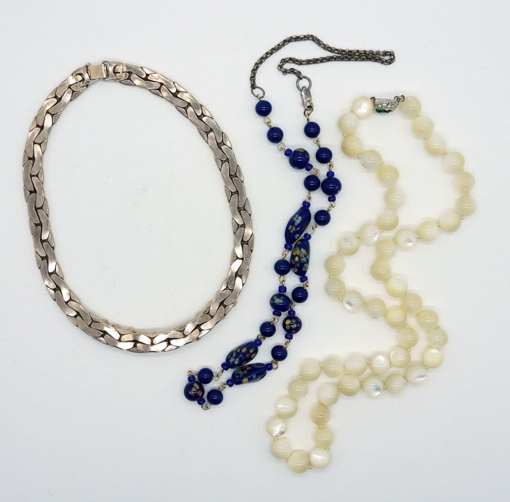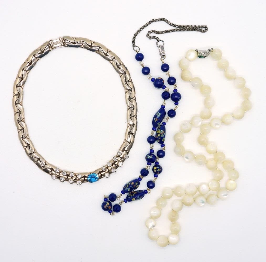 One rose gold tone 14 in think chain necklace with blue and white rhinestones, handstrung, shell beaded necklace with green rhinestone jeweled clasp 22 inches long, blue multi-colored enamel beads on 21 inch chain.