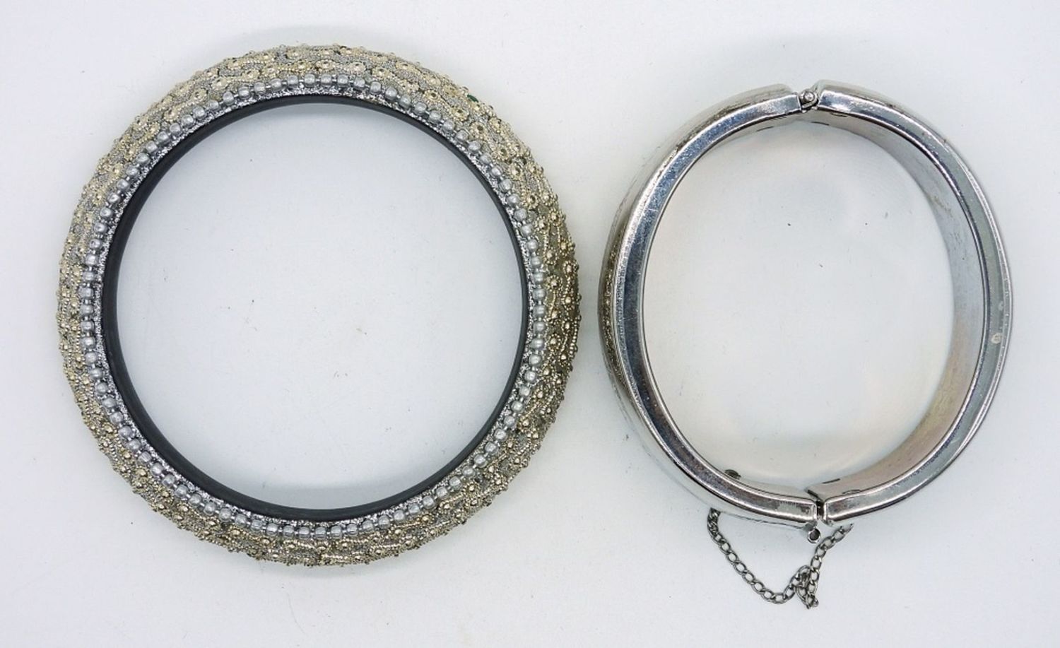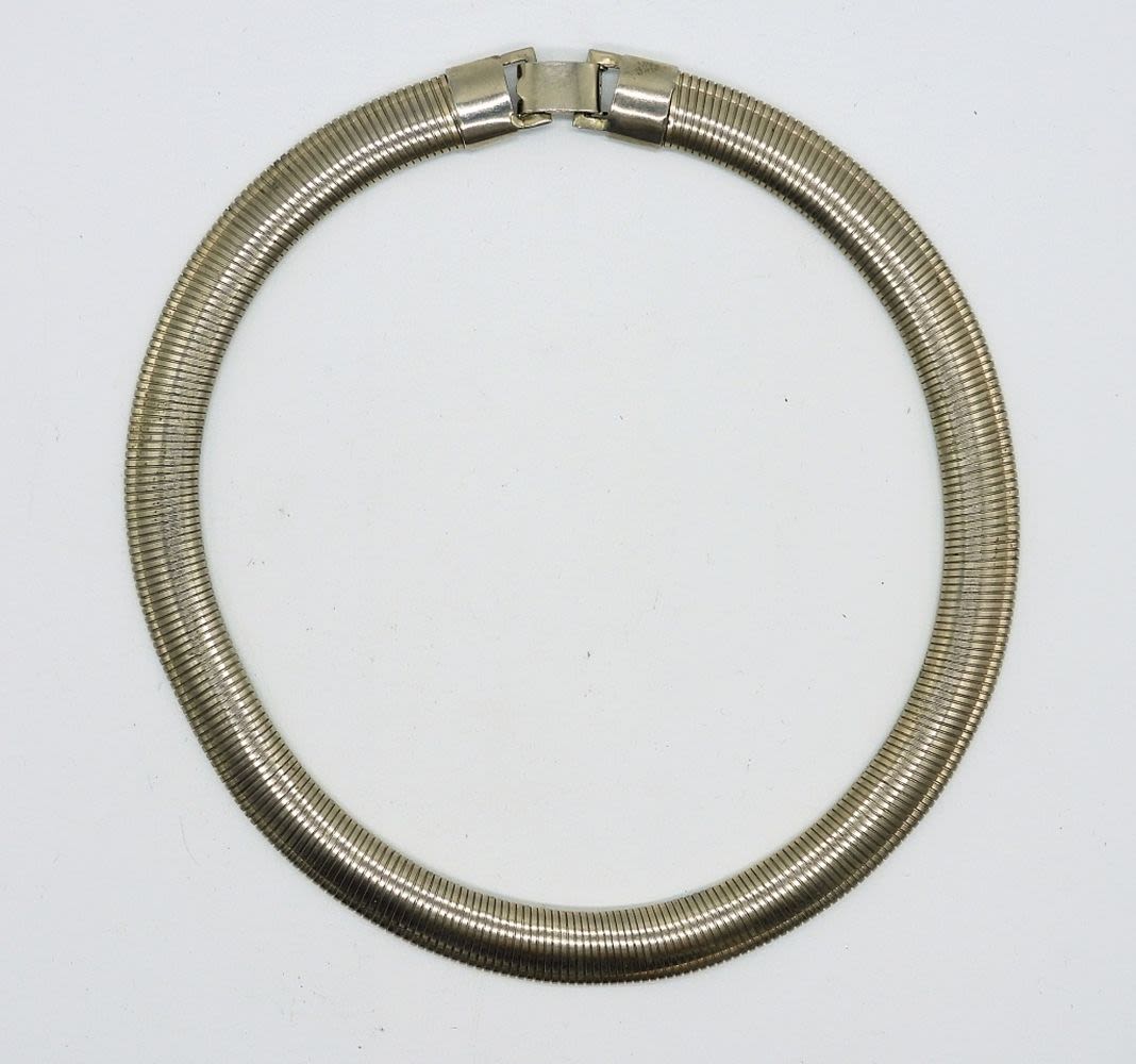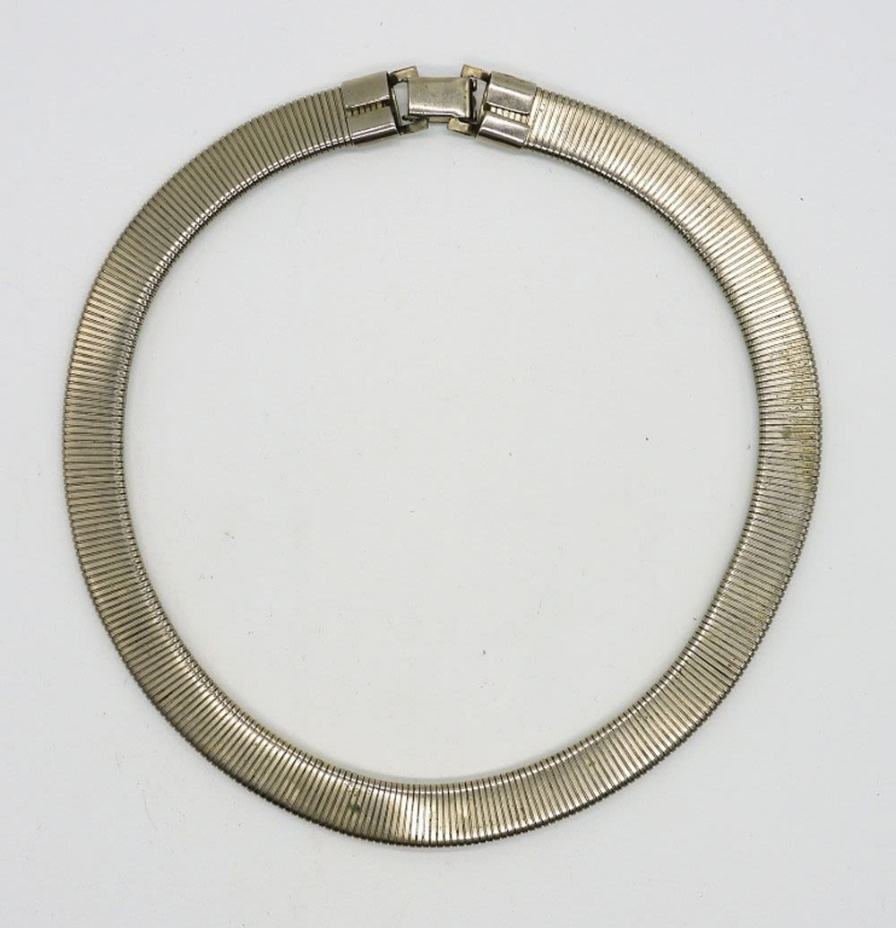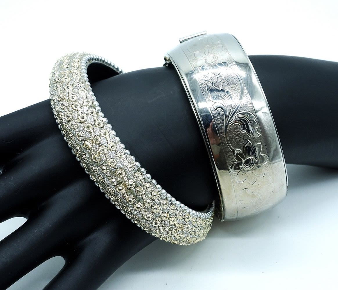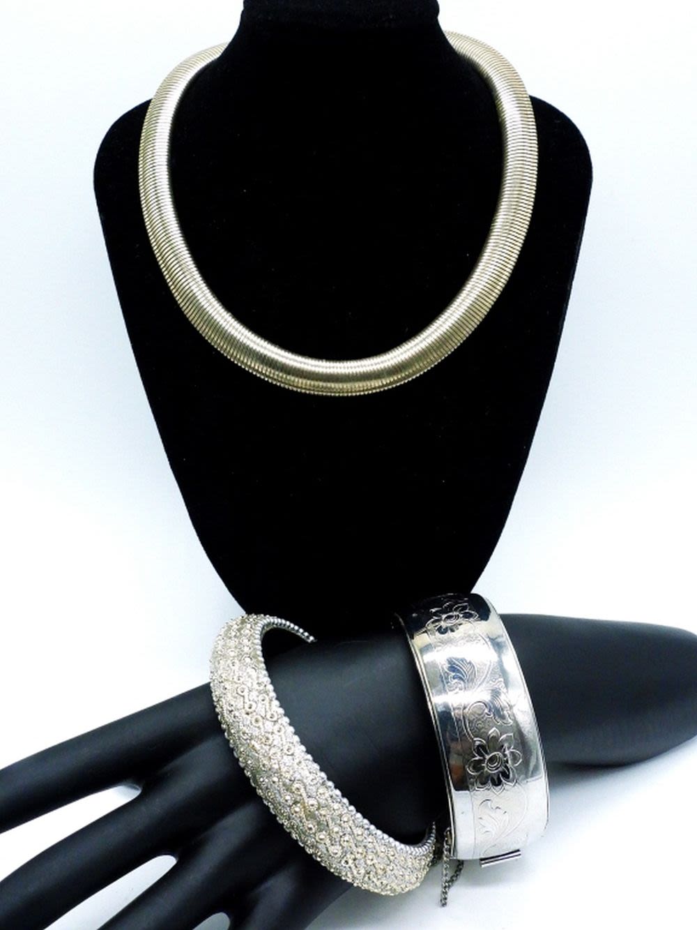 All silver tone. Bracelets 7.5 ” and 7″. Necklace 15″
