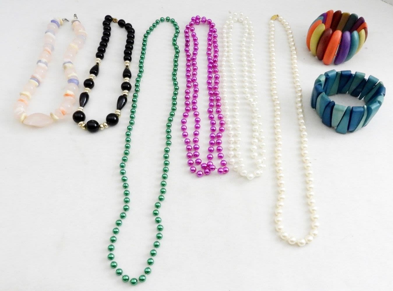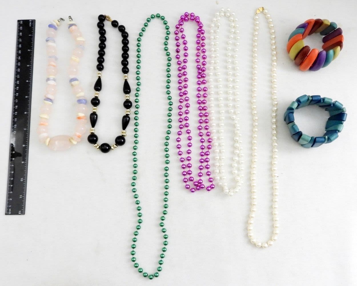 (6) BEADED NECKLACES WITH LARGE CHUNKY BEADS, FAUX PEARLS – LENGTH VARY 17″-24″; (2) STRETCHY BRACELETS WITH LARGE WOODEN BEADS